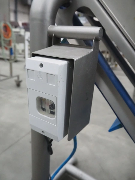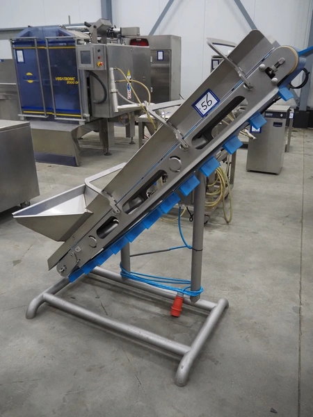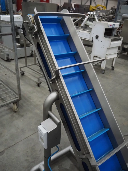Elevating belt with dividers, s/s frame, plastic belt, belt width: 210 mm, elevating height: 1400 mm, distance between dividers: 140 mm, divider height: 50 mm, total dimensions: 1500 mm x 700 mm x 1550 mm.
