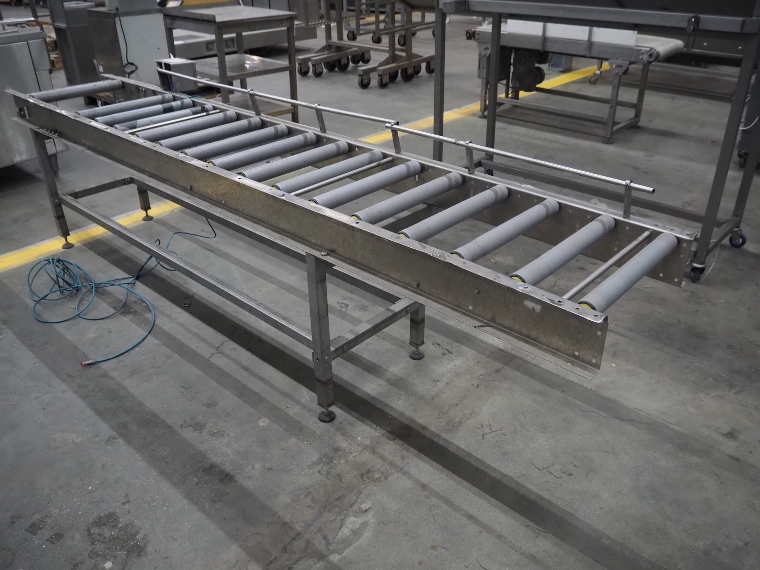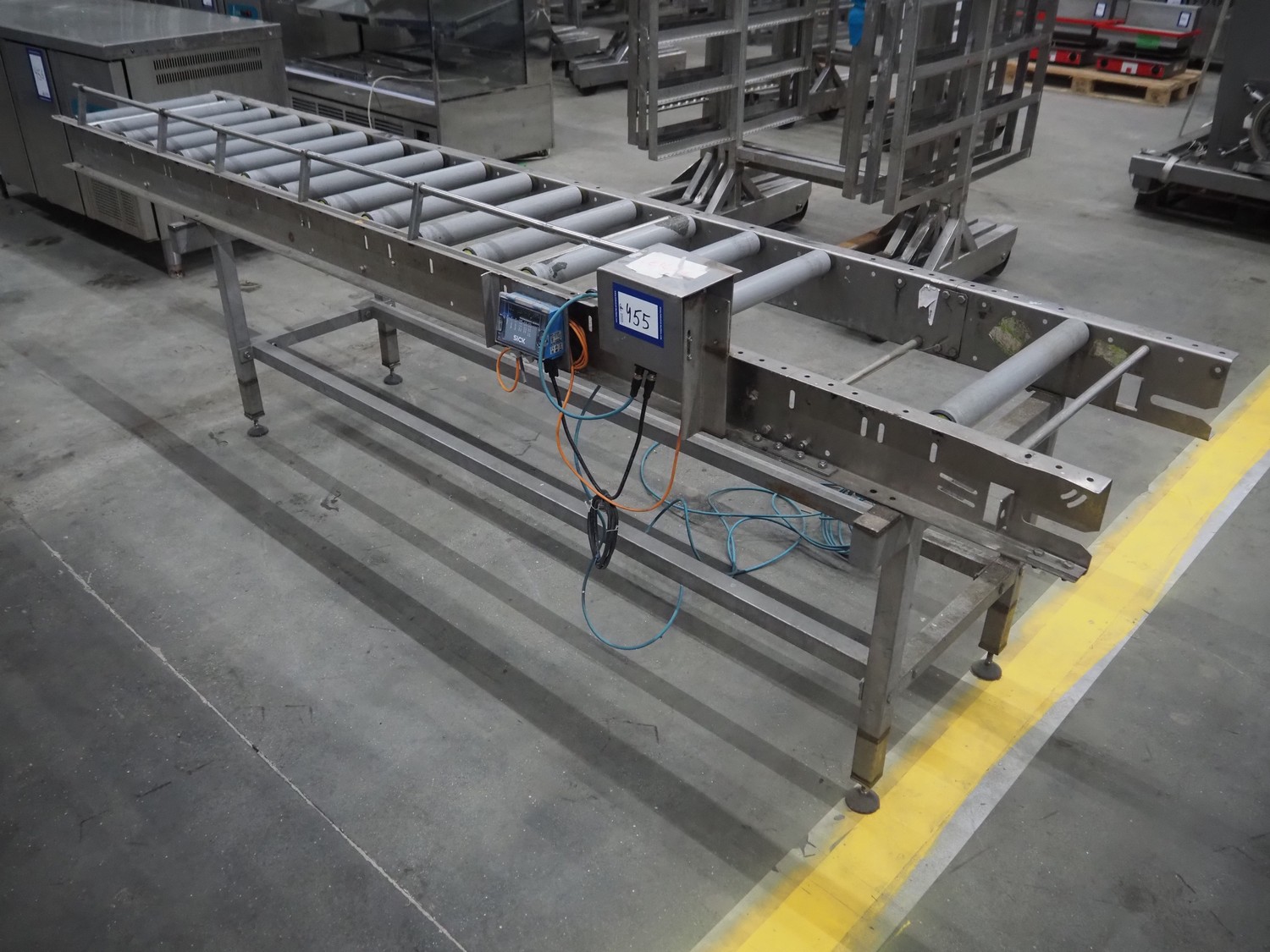 S/s roller conveyor, plastic rollers, roller width: 450 mm, total dimensions: 3100 mm x 660 mm x 900 mm. Missing rollers.