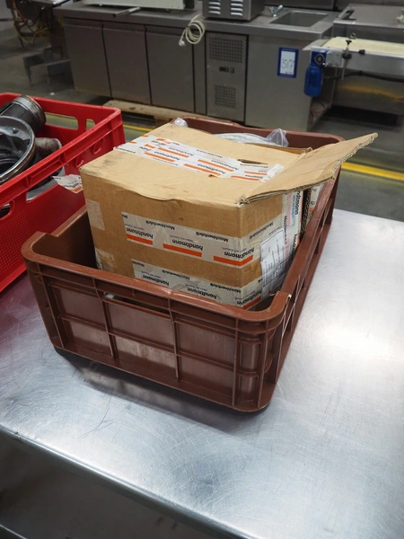 Plastic crate with Handtmann housing, dimensions: 600 mm x 400 mm x 200 mm.