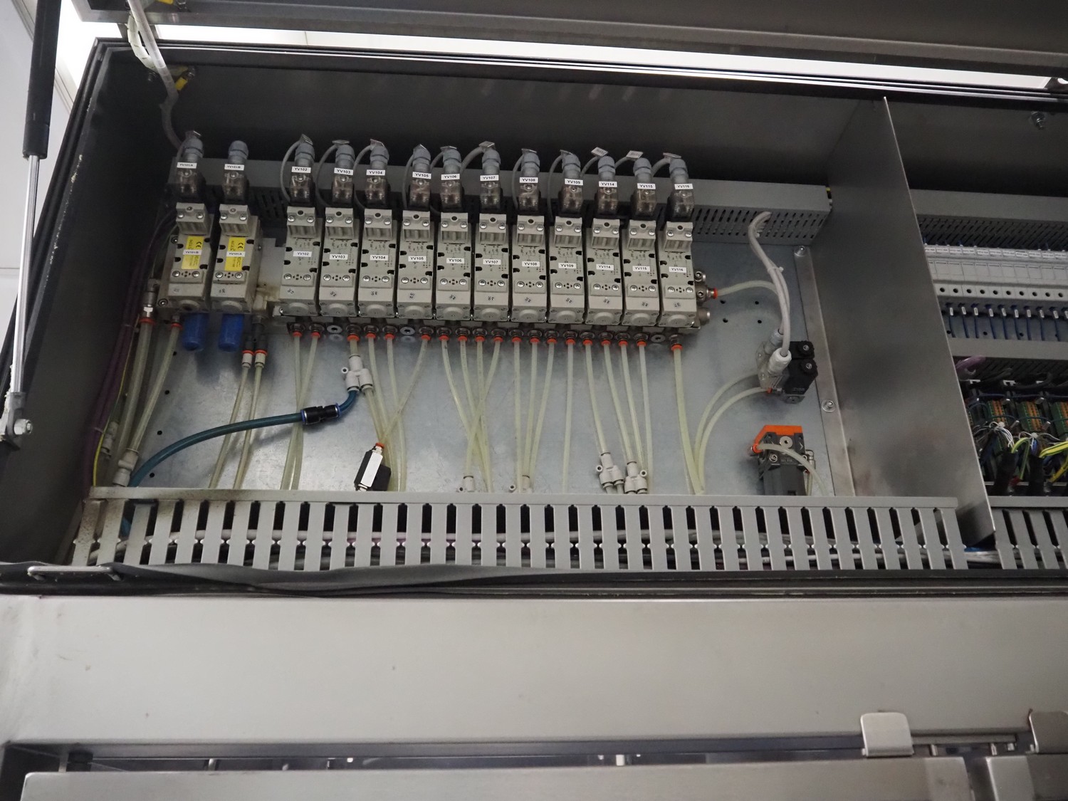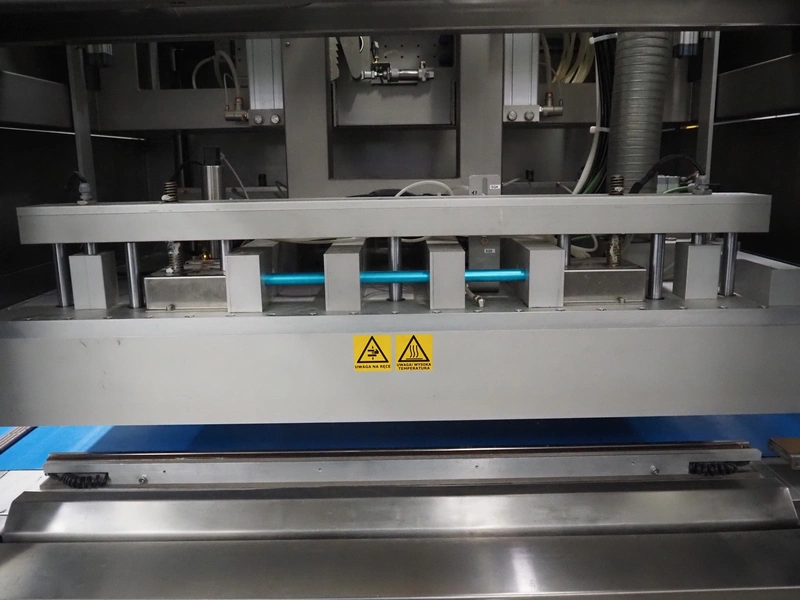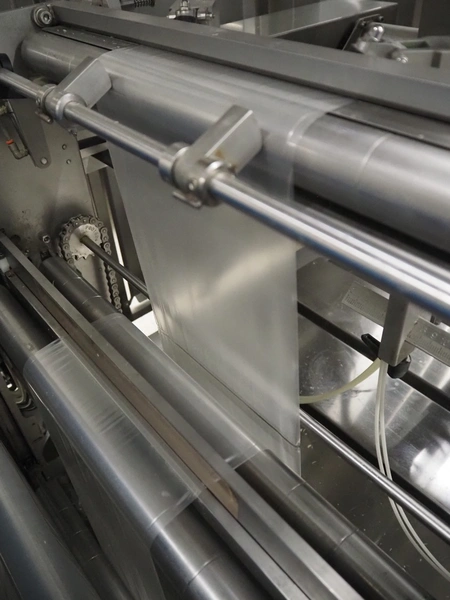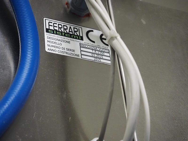 Complete with slicer for portioning the products into blocks of various sizes, bagging machine for creating bags from tubular film and vacuum machine, type: MACCHINA VUOTO, model: T.R.1350, serial number: 03.2015, year of construction: 2015, 400 V, 3 Ph, 50 Hz, plastic belt, belt width: 400 mm and 700 mm, clearance: 510 mm x 170 mm, knife width: 400 mm, film width: 260 mm, seal length: (4x) 1400 mm, total dimensions: 7400 mm x 1700 mm x 2630 mm.