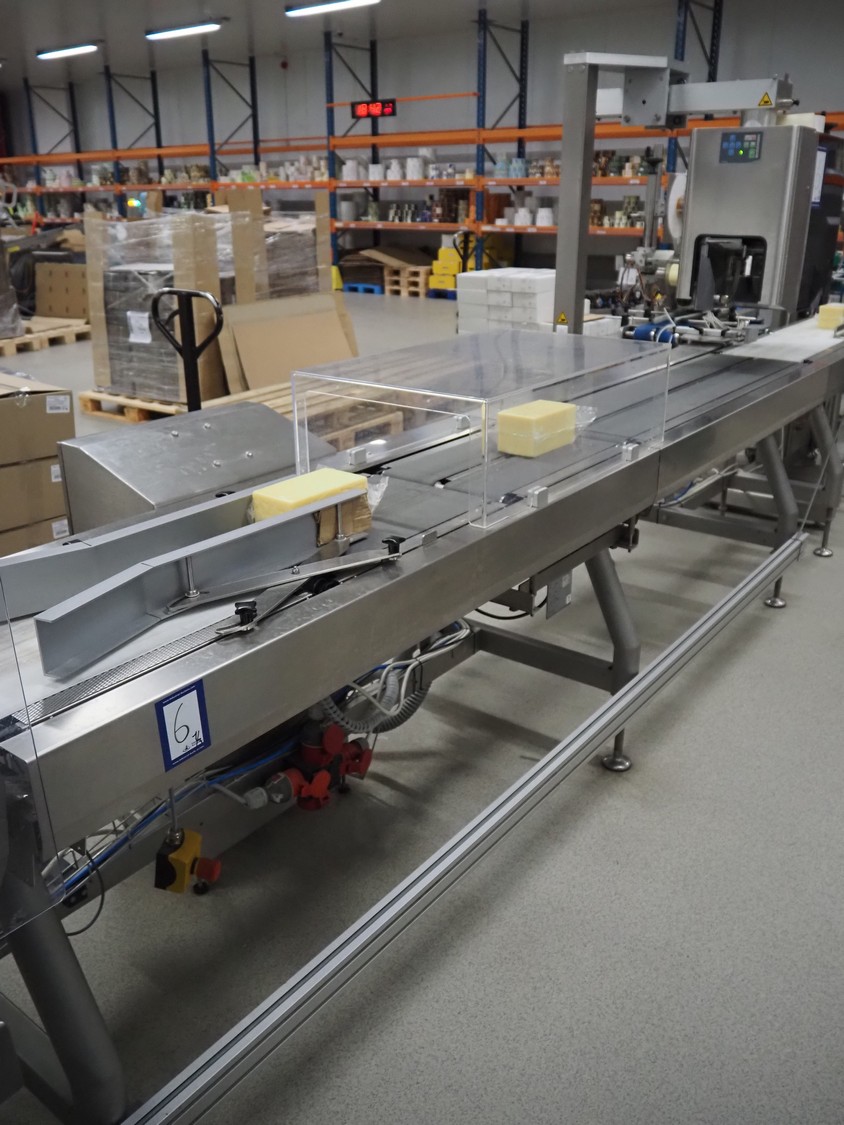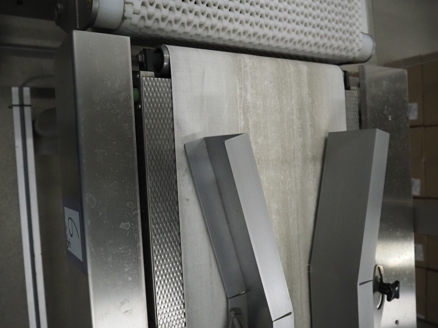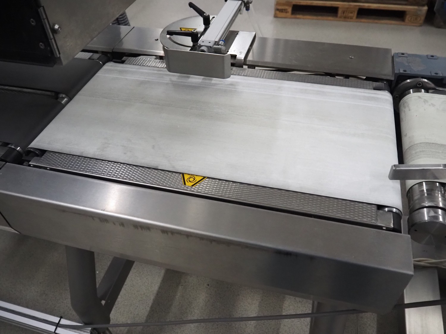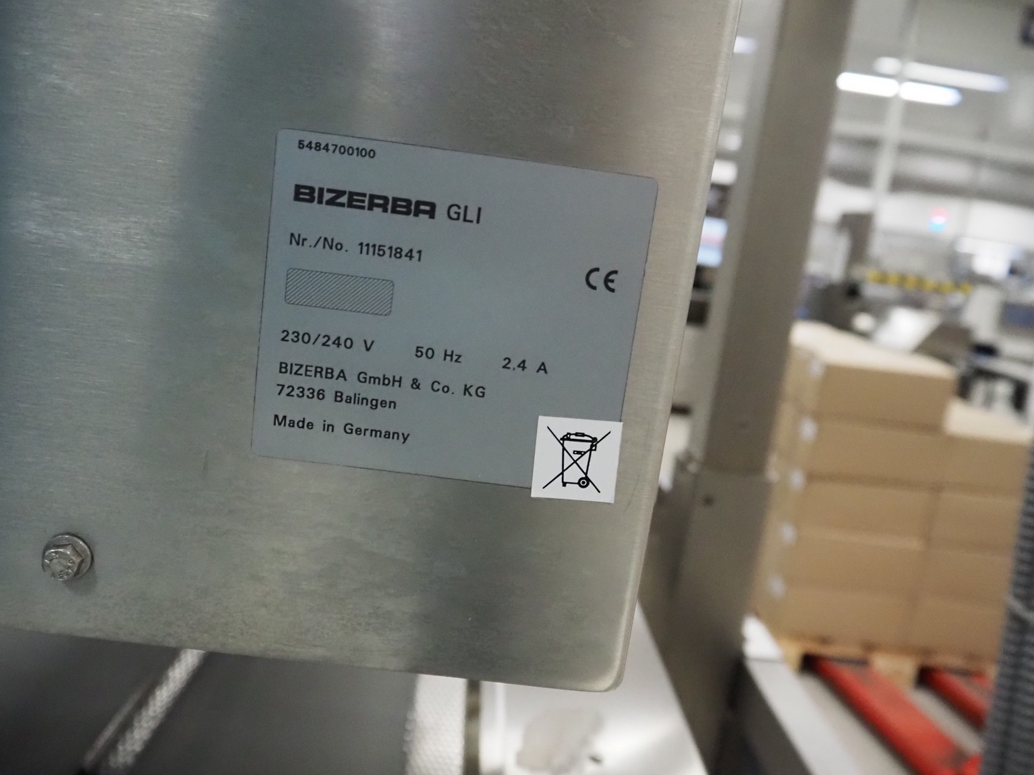 Bizerba GmbH & Co. KG weighing and labeling machine, type: GLI, machine number: 11151841, 230/240 V AC, 50 Hz, 2.4 A, CE certified, plastic belt, belt width: (3x) 300 mm, (4x) 135 mm, total dimensions: 3720 mm x 950 mm x 2270 mm.
