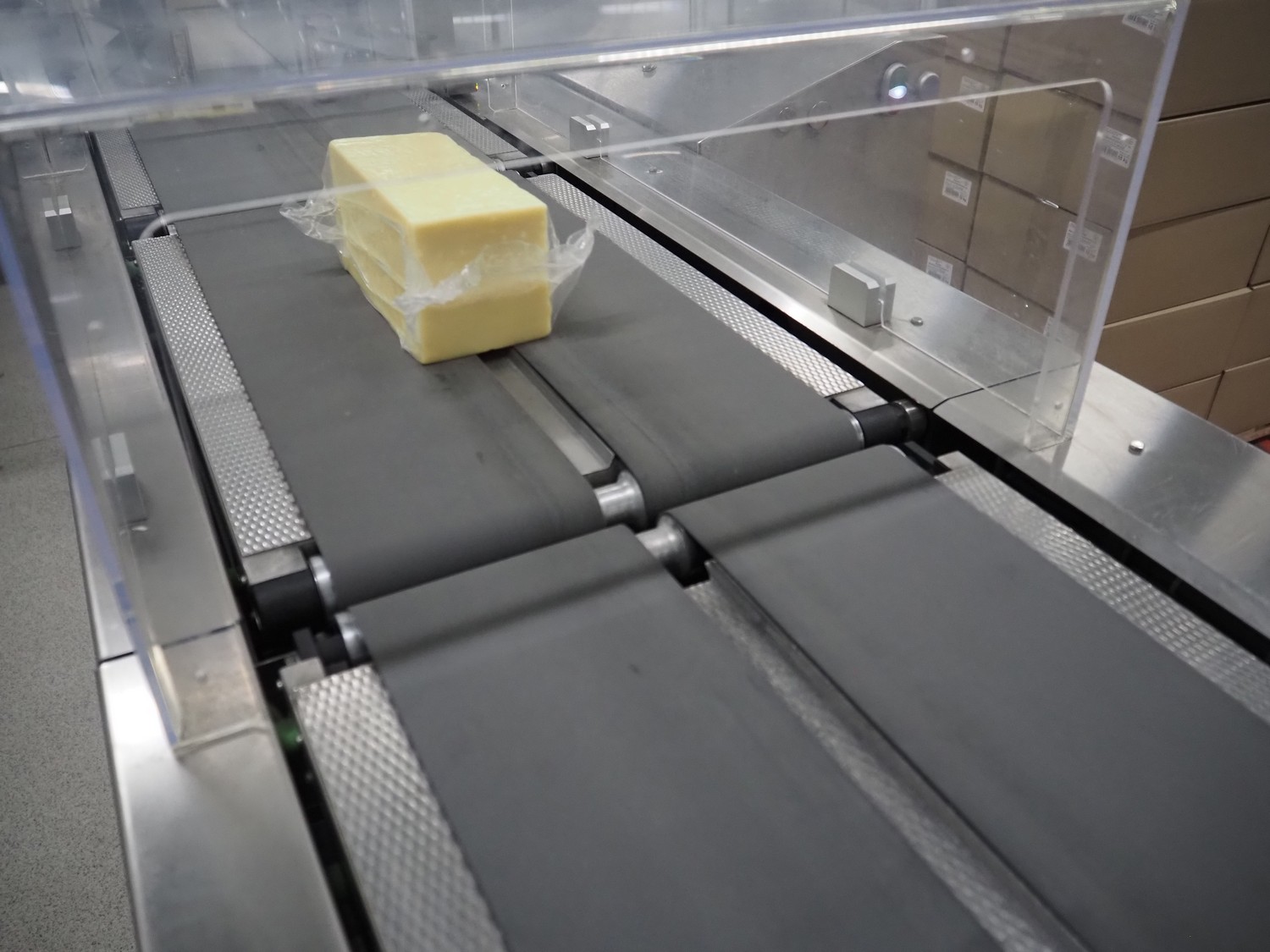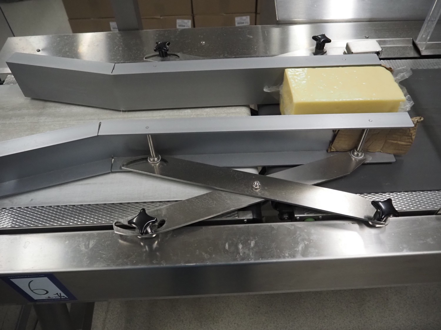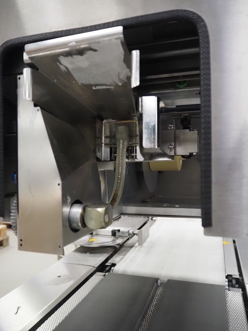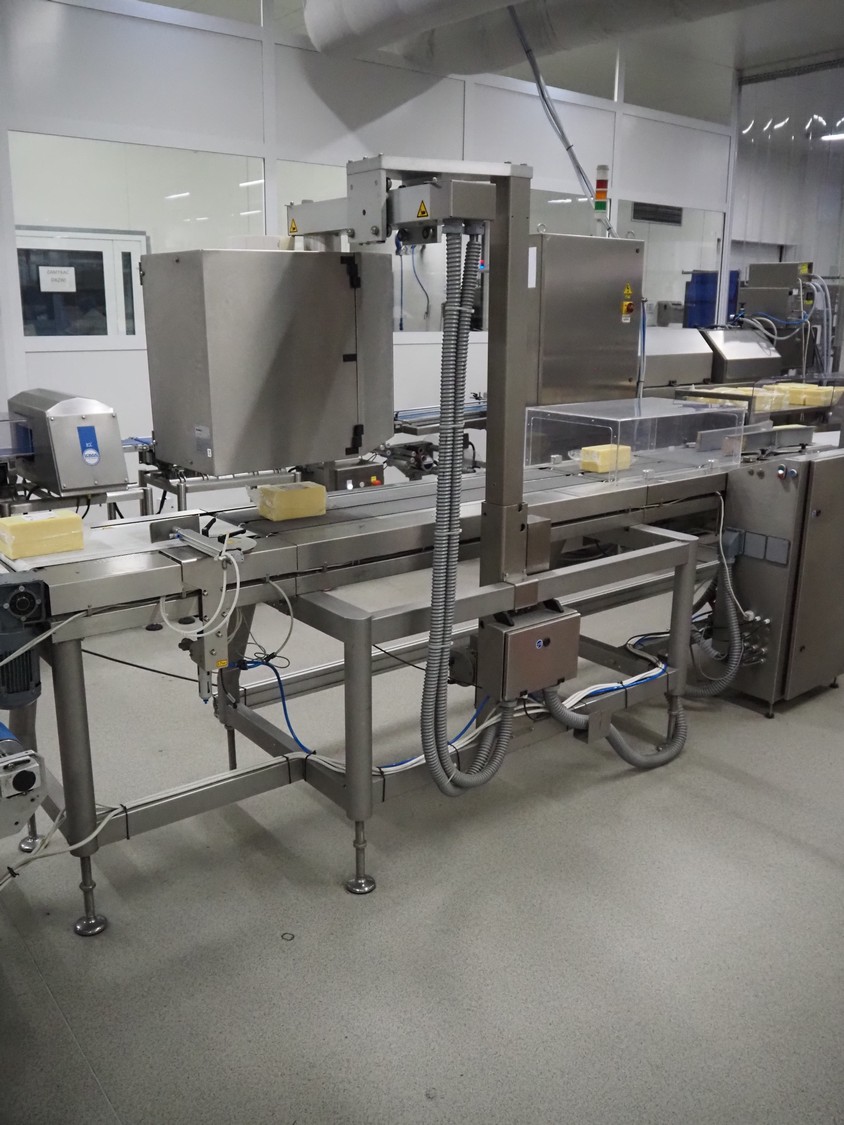 Bizerba GmbH & Co. KG weighing and labeling machine, type: GLI, machine number: 11151841, 230/240 V AC, 50 Hz, 2.4 A, CE certified, plastic belt, belt width: (3x) 300 mm, (4x) 135 mm, total dimensions: 3720 mm x 950 mm x 2270 mm.