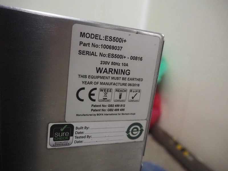 Markem Imaje laser fume extractor, type: ES500i+, serial number: 00816, year of construction: 06/2018, 230 V, 50 Hz, 10 A, dimensions: 600 mm x 430 mm x 980 mm.