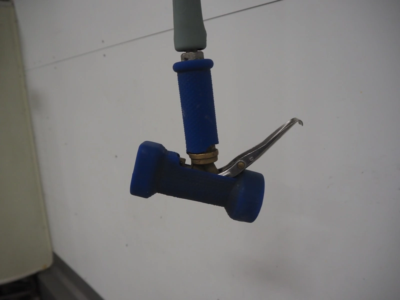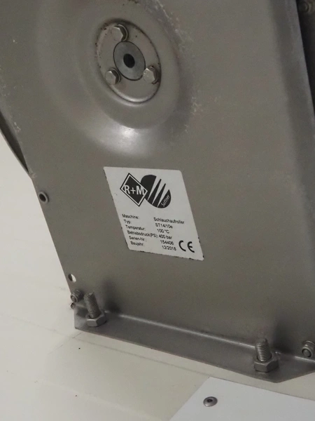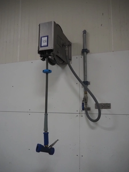 S/s hose reel with hose and pistol, dimensions: 430 mm x 230 mm x 420 mm.