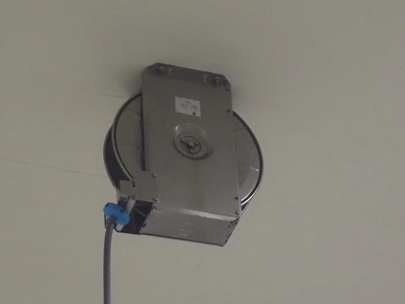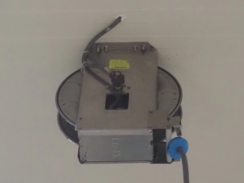 S/s hose reel with hose, dimensions: 430 mm x 230 mm x 420 mm.