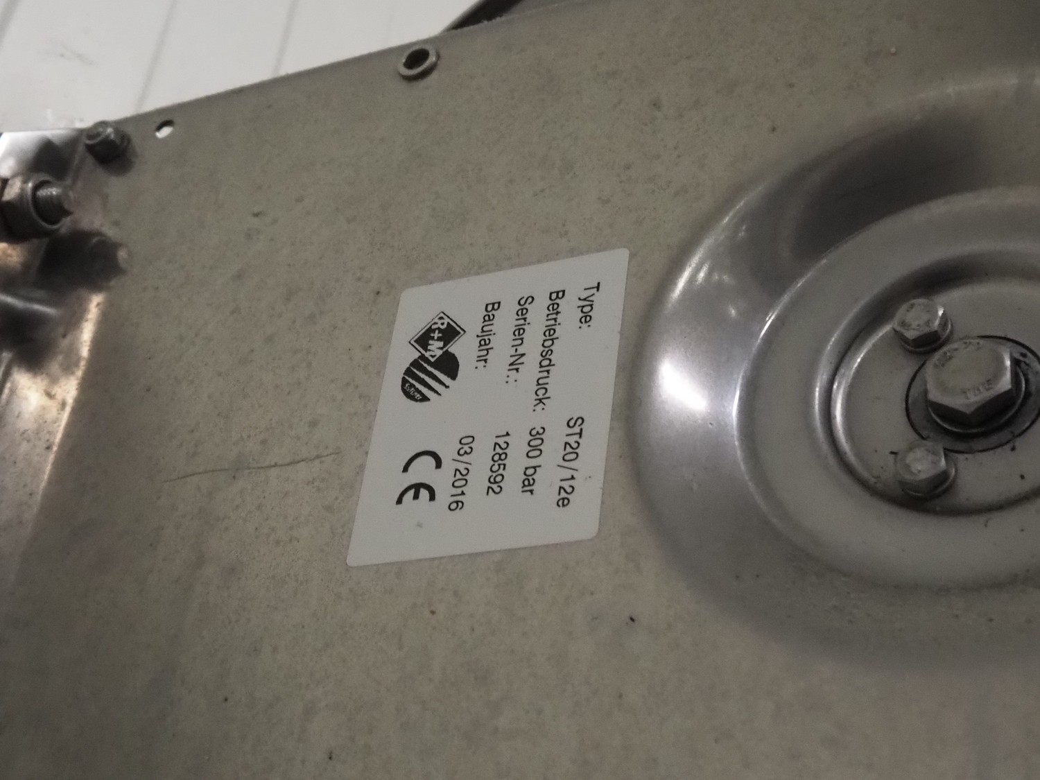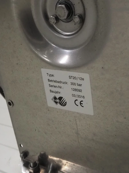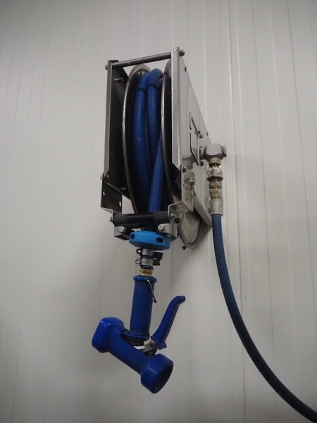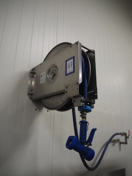 S/s hose reel with hose and pistol, dimensions: 430 mm x 230 mm x 420 mm.