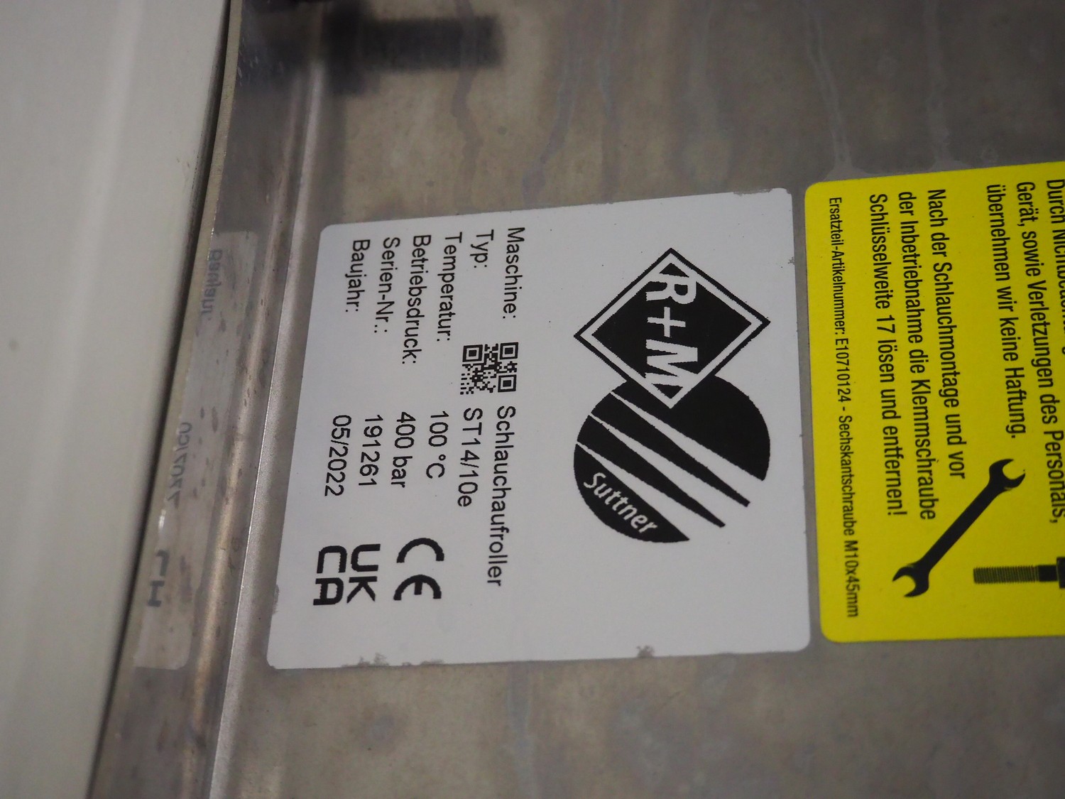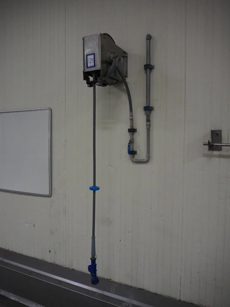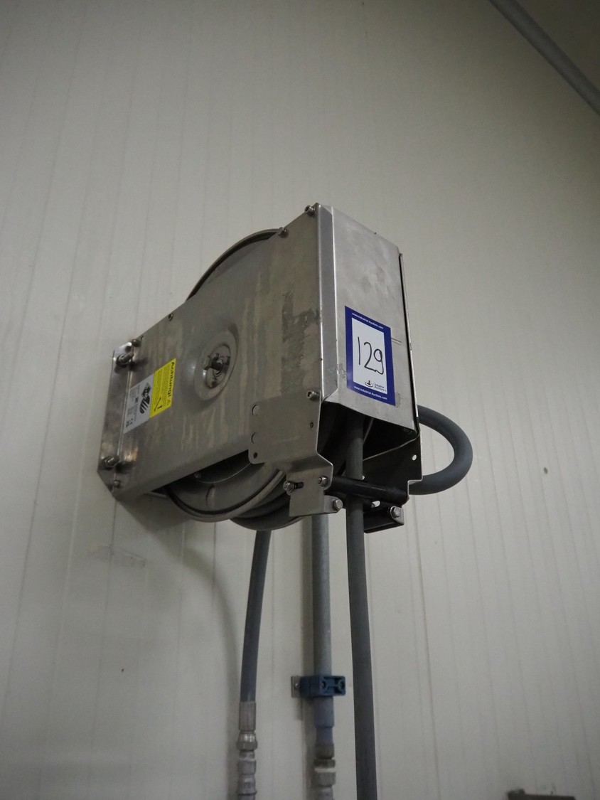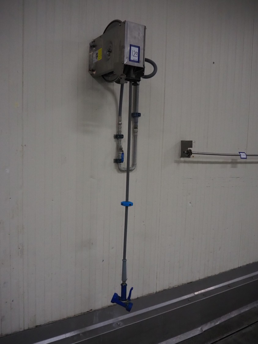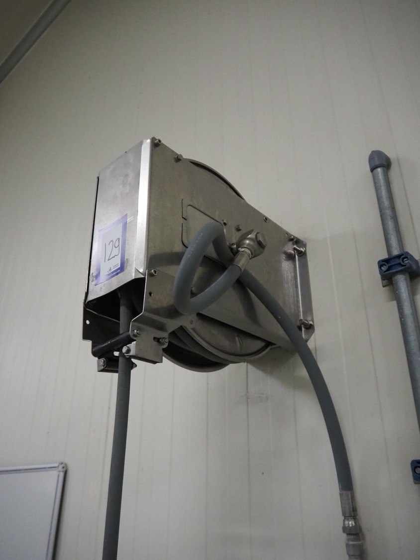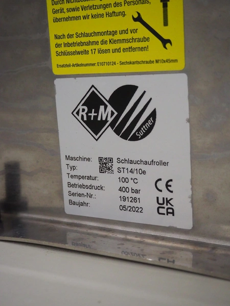 R+M s/s hose reel with hose and pistol, type: ST14/10e, serial number: 191261, year of construction: 05/2022, dimensions: 430 mm x 230 mm x 420 mm.