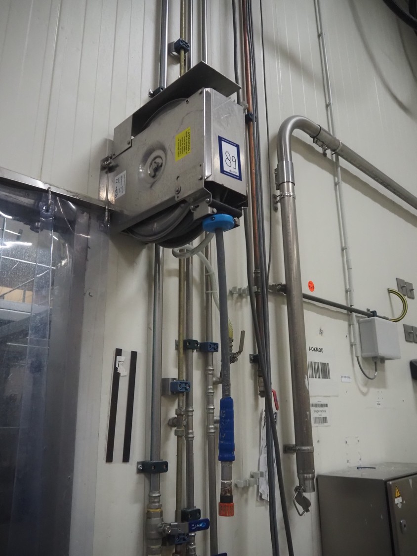 S/s hose reel with hose, dimensions: 430 mm x 230 mm x 420 mm.