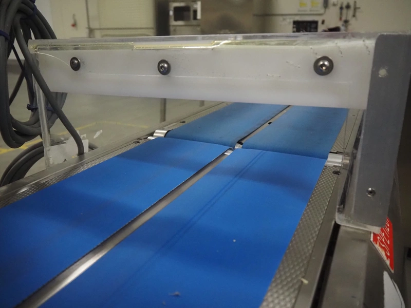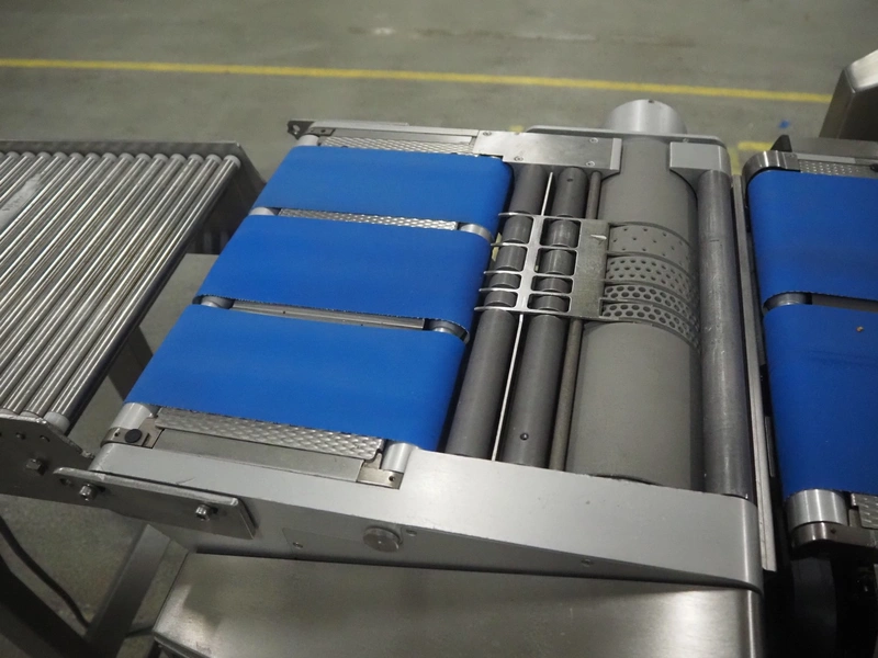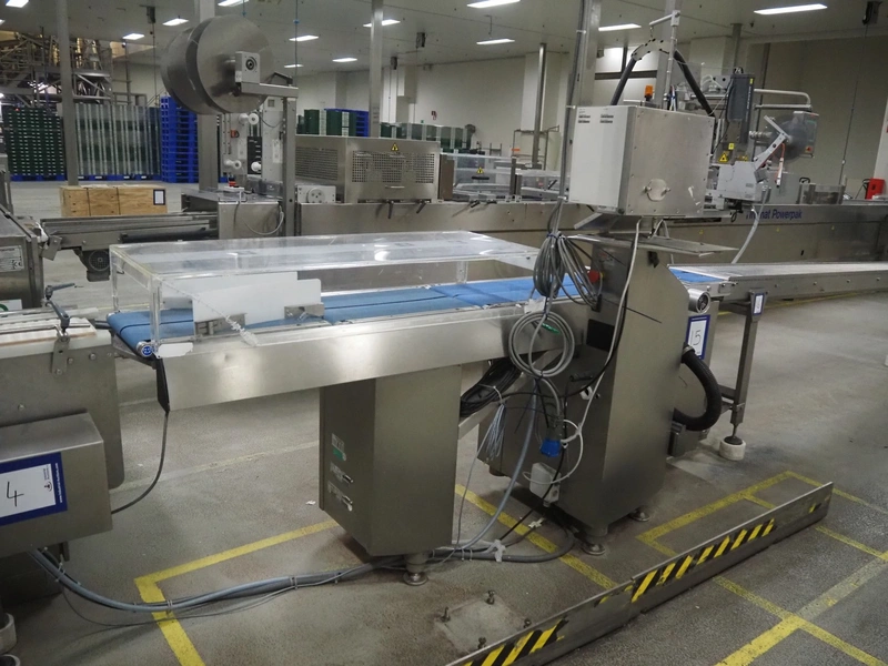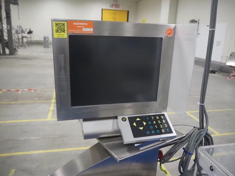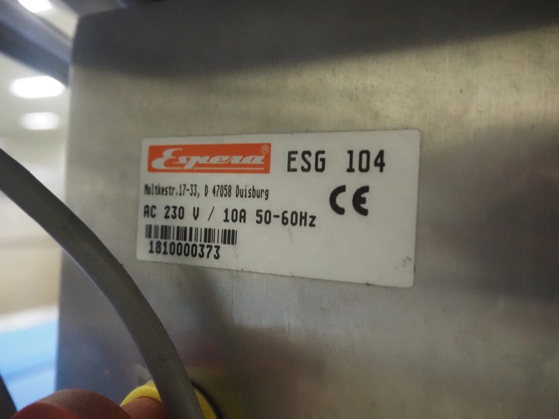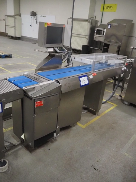 Espera weighing and labeling machine with bottom labeller, type: ES 7000, serial number: R C 0750100474, year of construction: 2009, 24 V, maximum: 3/6/8 kg, e= 1/2/5 g, minimum: 20 g, T= -3000 g, du= .01€/kg, dp= 0.01 €, plastic belt, belt width: (6x) 140 mm, (3x) 90 mm, clearance: 375 mm x 120 mm, total dimensions: 2400 mm x 700 mm x 1490 mm.
