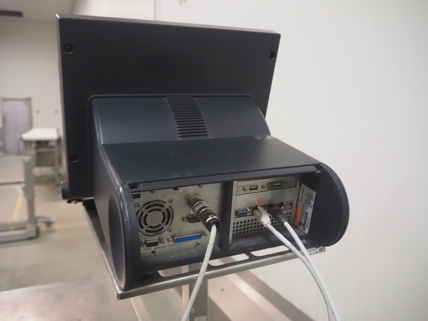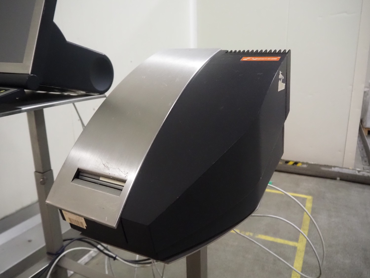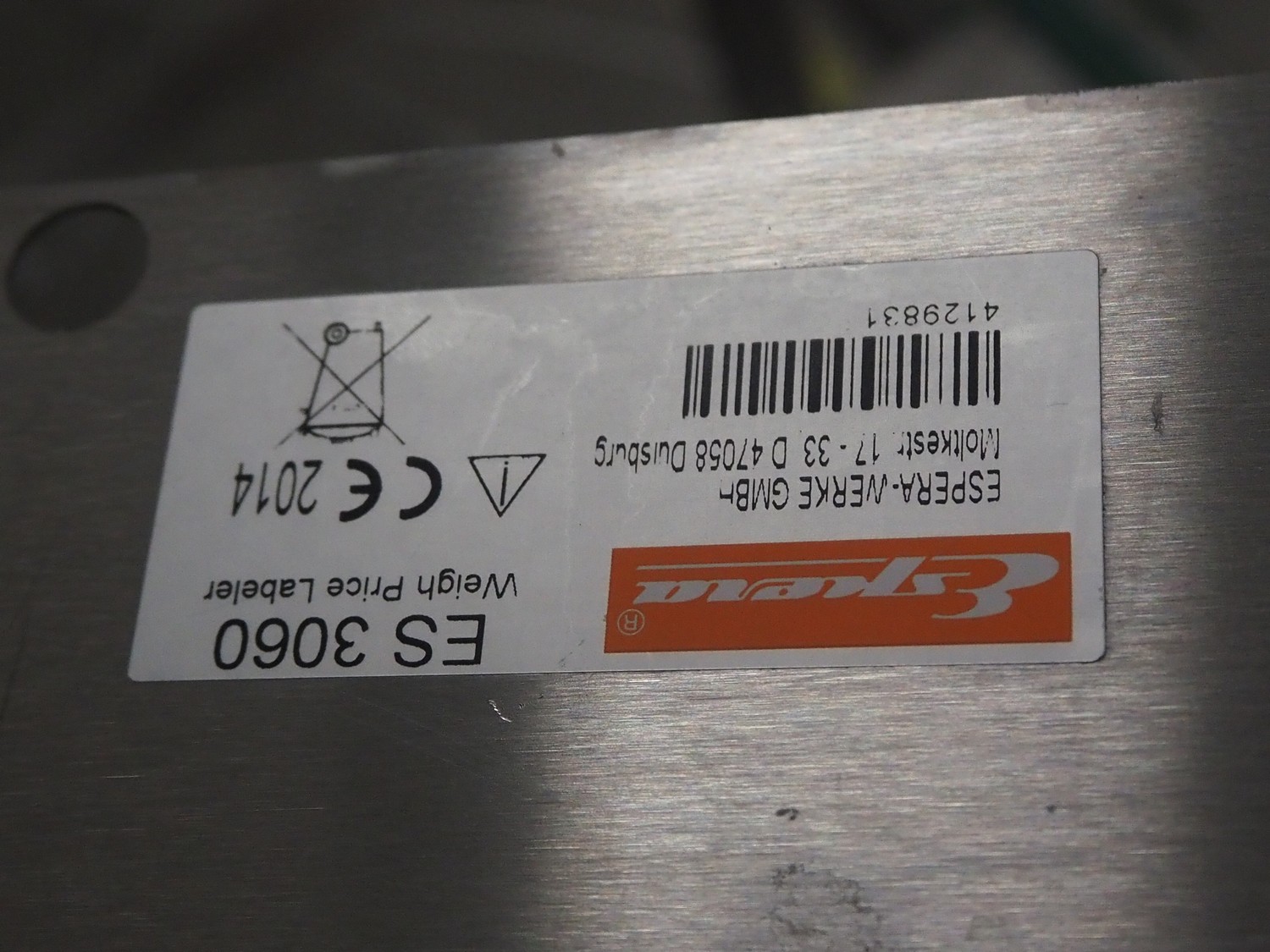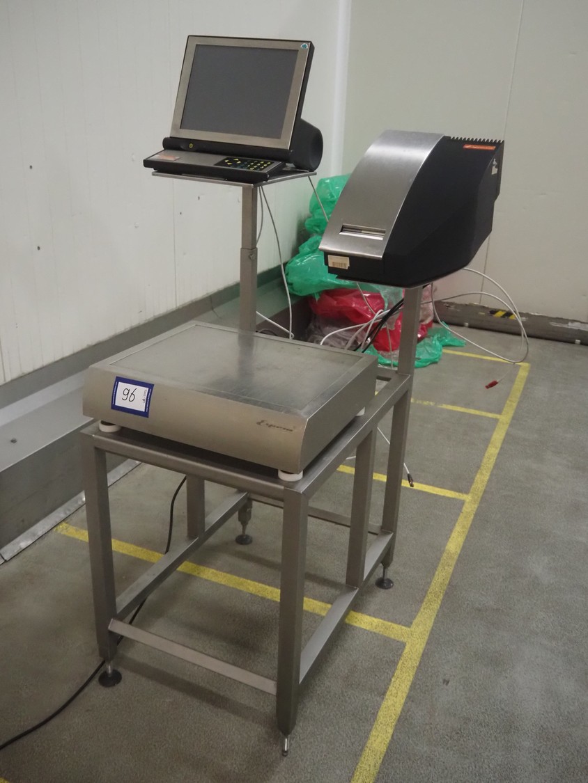 Espera weighing scale with indicator and label printer, type weighing scale: ES3060, year of construction: 2014, capacity: 100 kg, scale dimensions: 480 mm x 370 mm, type indicator: ESC 964, type label printer: ESD 104, 230 V, 50/60 Hz, total dimensions: 1000 mm x 860 mm x 1620 mm.