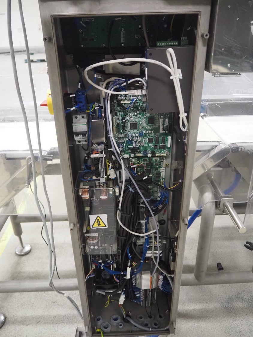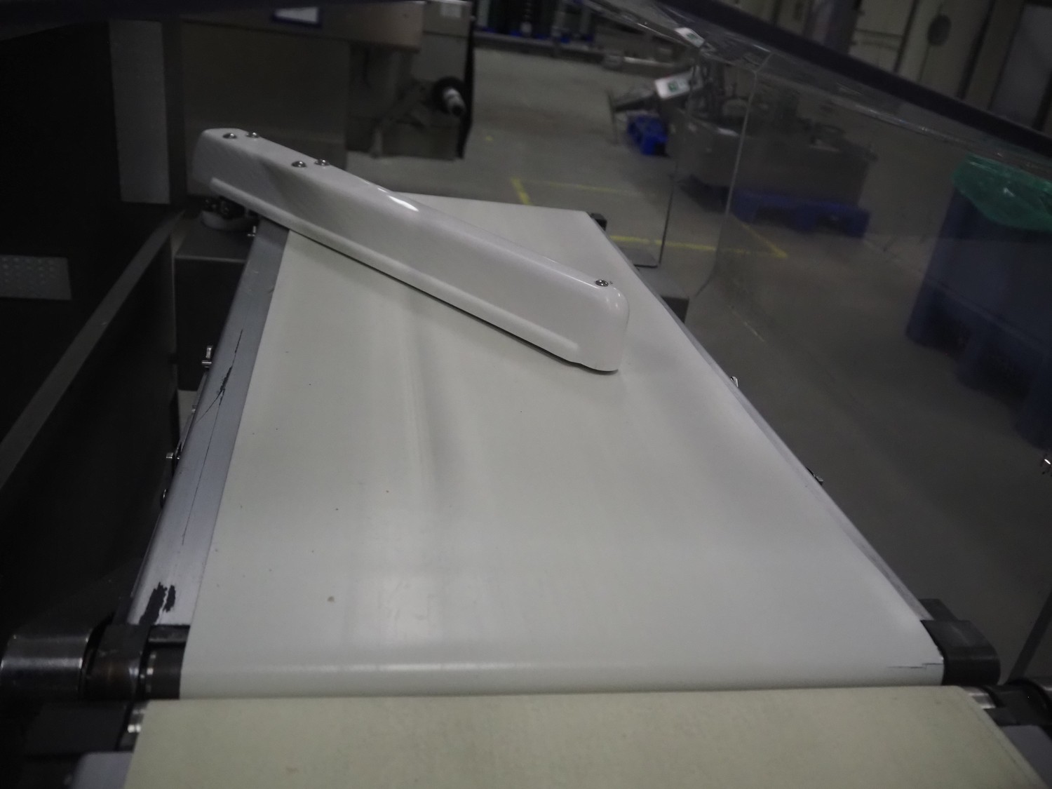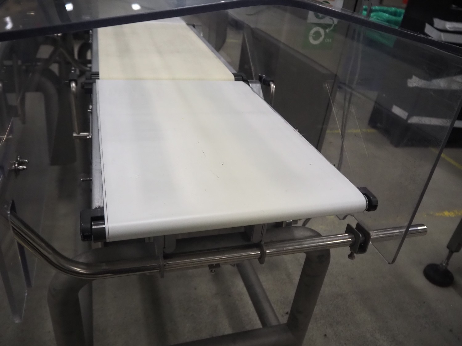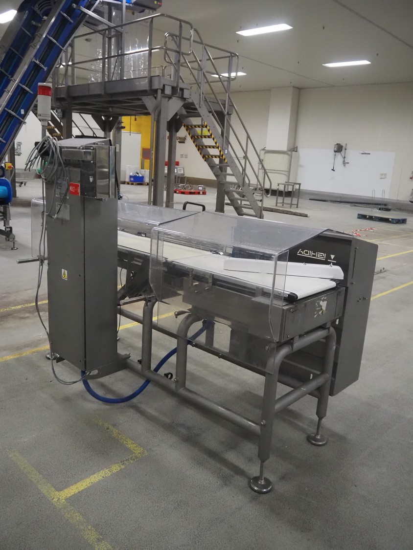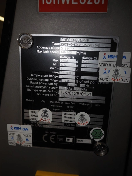 Ishida checkweigher with rejector, type: DACS-G-S060-36/WP-I-S, serial number: 562767, year of construction: 02-2013, 240 V, 1 Ph, 50 Hz, 4.5 A, clearance: 600 mm x 220 mm, plastic belt, belt width: (3x) 340 mm, total dimensions: 1950 mm x 1200 mm x 1680 mm.