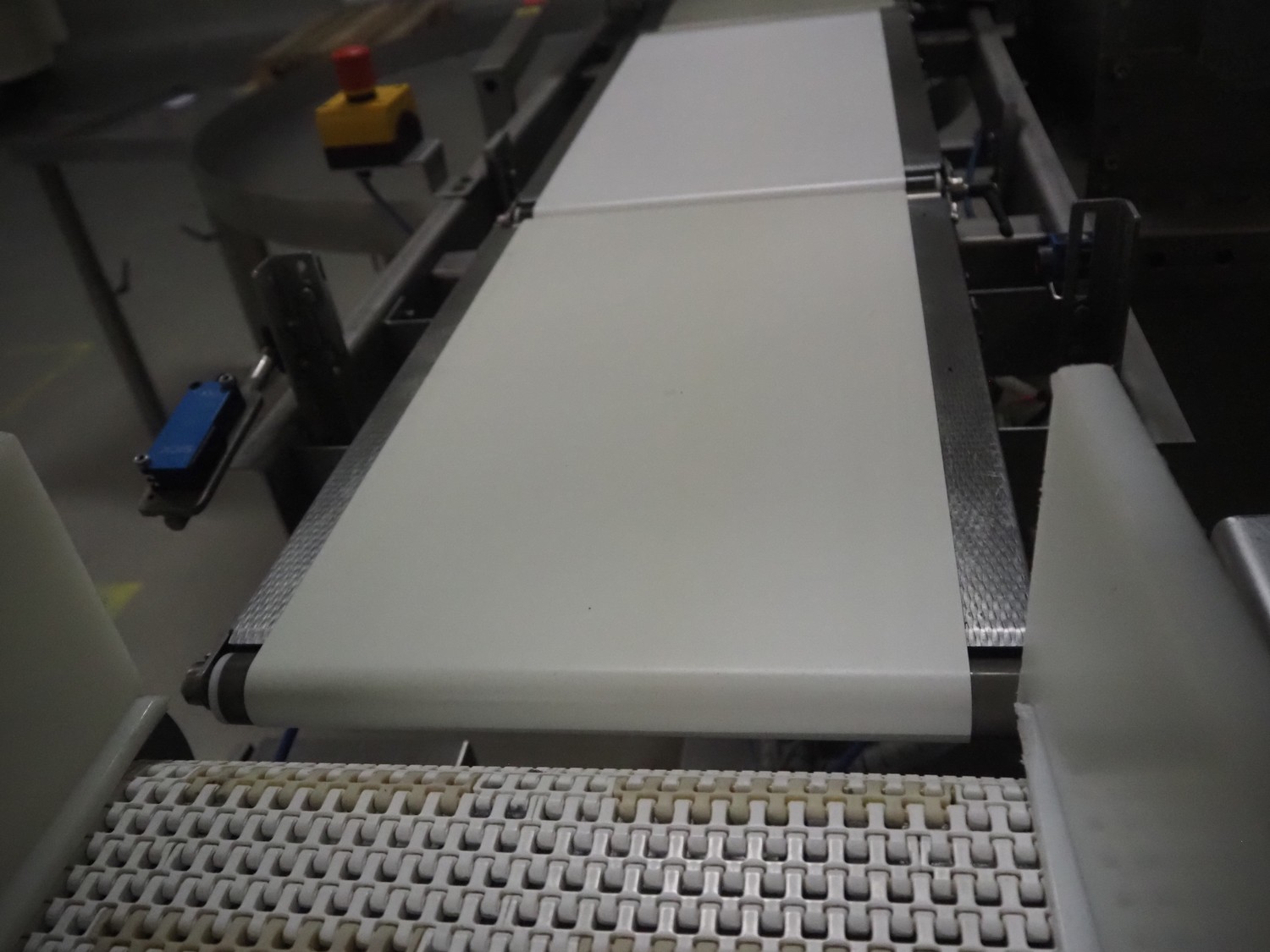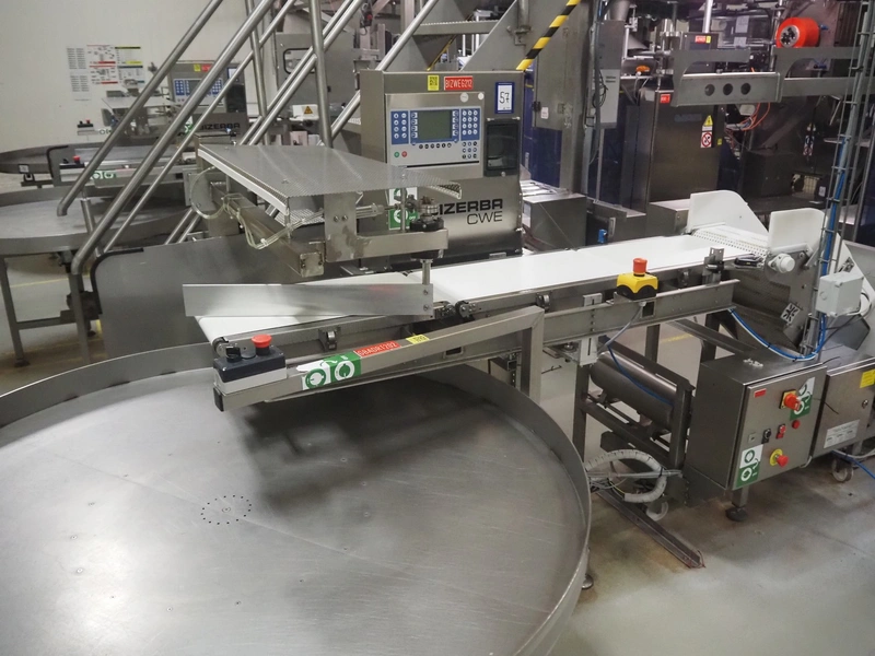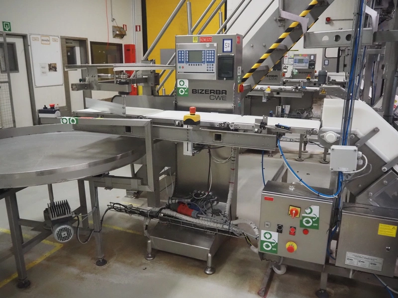 Bizerba checkweigher with rejector, model: CWE, serial number: 10754551, year of construction: M 11, 220/240 V, 50/60 Hz, 5.0/3.0 A, maximum: 1500/3000 g, minimum: 50 g, e=d= 0.5/1 g, plastic belt, belt width: (3x) 300 mm, total dimensions: 1820 mm x 930 mm x 1700 mm.
