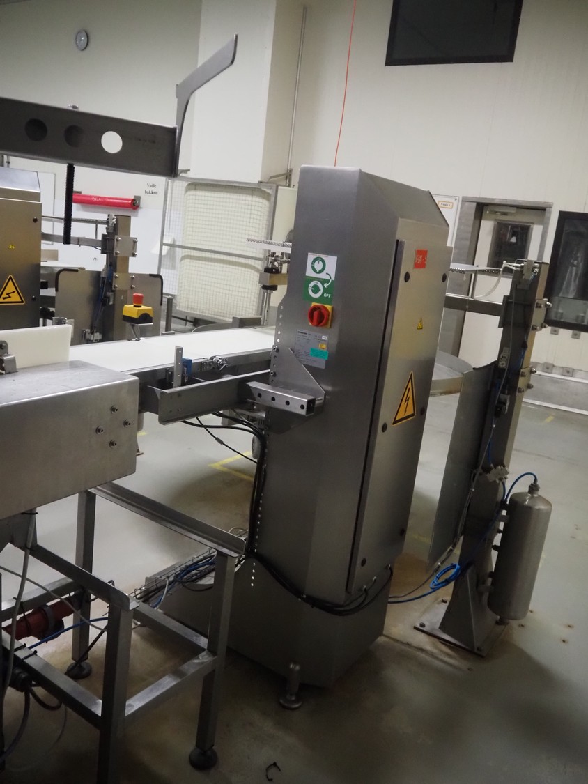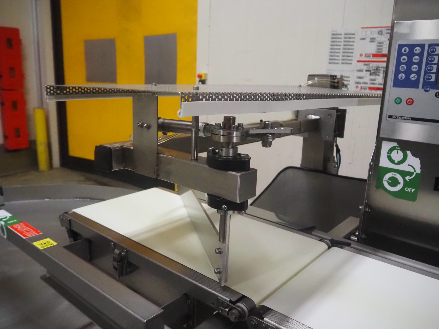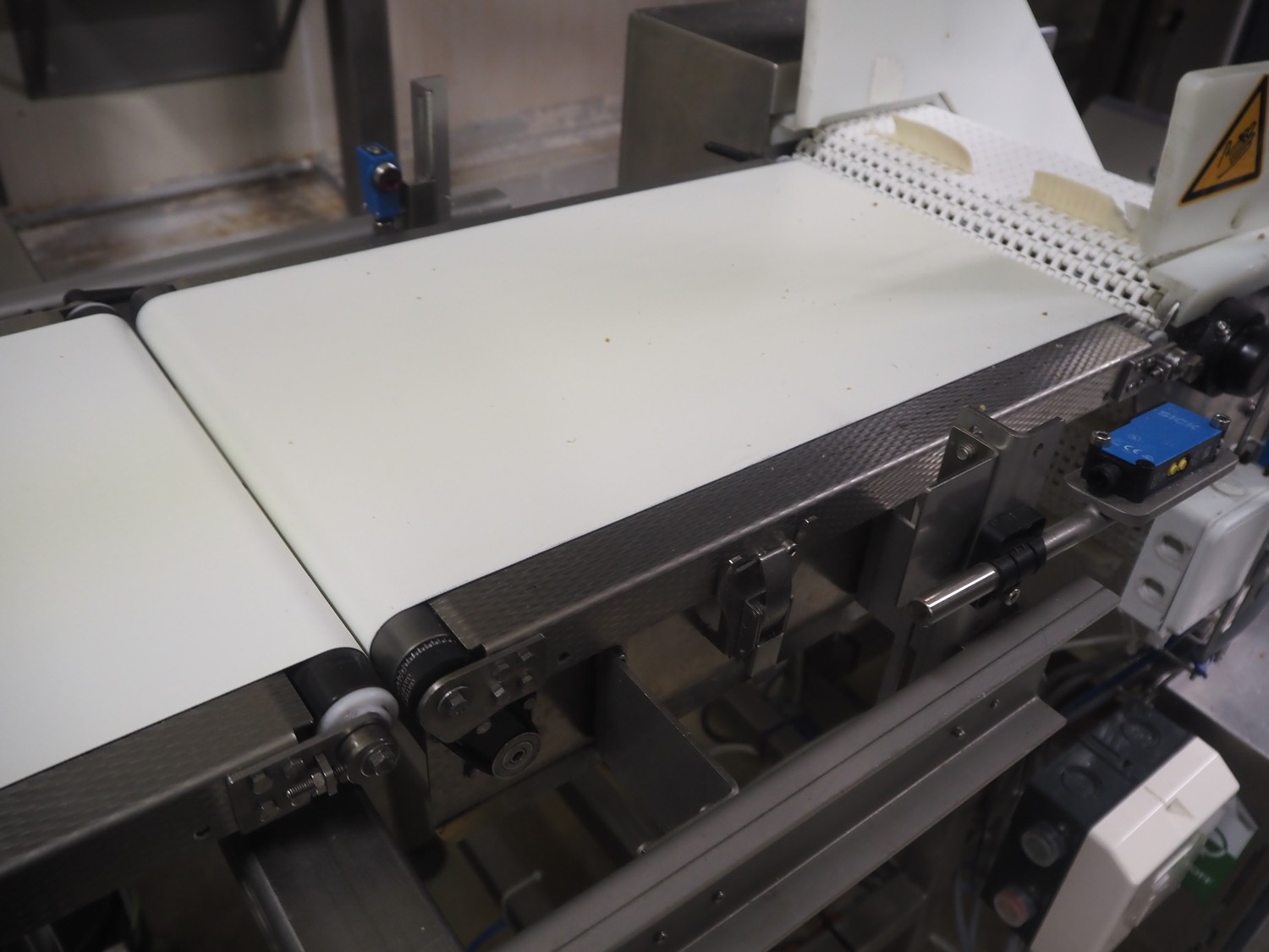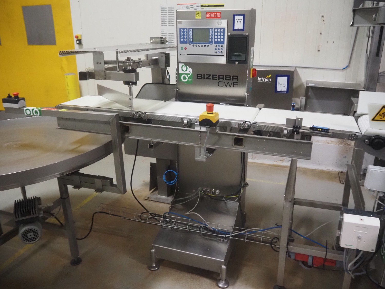 Bizerba checkweigher with rejector, model: CWE, serial number: 10754550, year of construction: M 11, 220/240 V, 50/60 Hz, 5.0/3.0 A, maximum: 1500/3000 g, minimum: 50 g, e=d= 0.5/1 g, plastic belt, belt width: (3x) 300 mm, total dimensions: 1820 mm x 930 mm x 1700 mm.