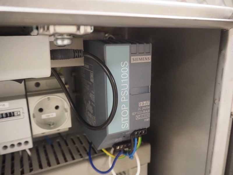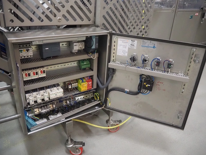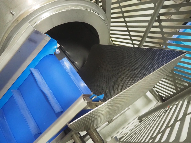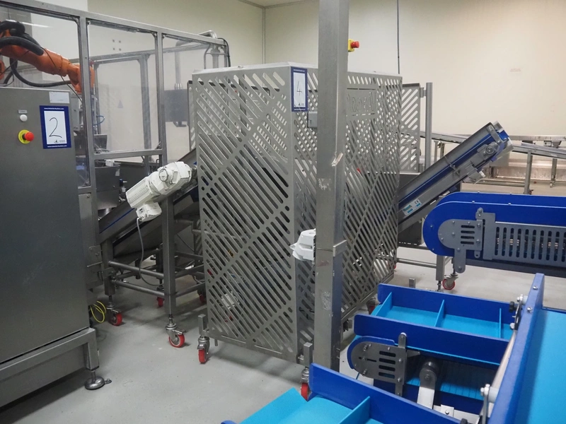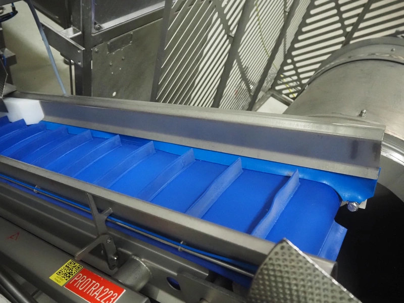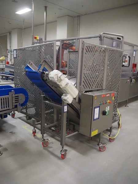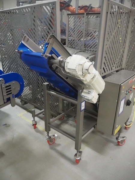 - Infeed elevating belt, type: TB-304,L=1600-29°, number: 122698, year of construction: 2014, weight: 115 kg, plastic belt with dividers, belt width: 250 mm, dividers height: 35 mm, distance between dividers: 120 mm, elevating height: 1130 mm, elevating belt dimensions: 1470 mm x 670 mm x 1250 mm.