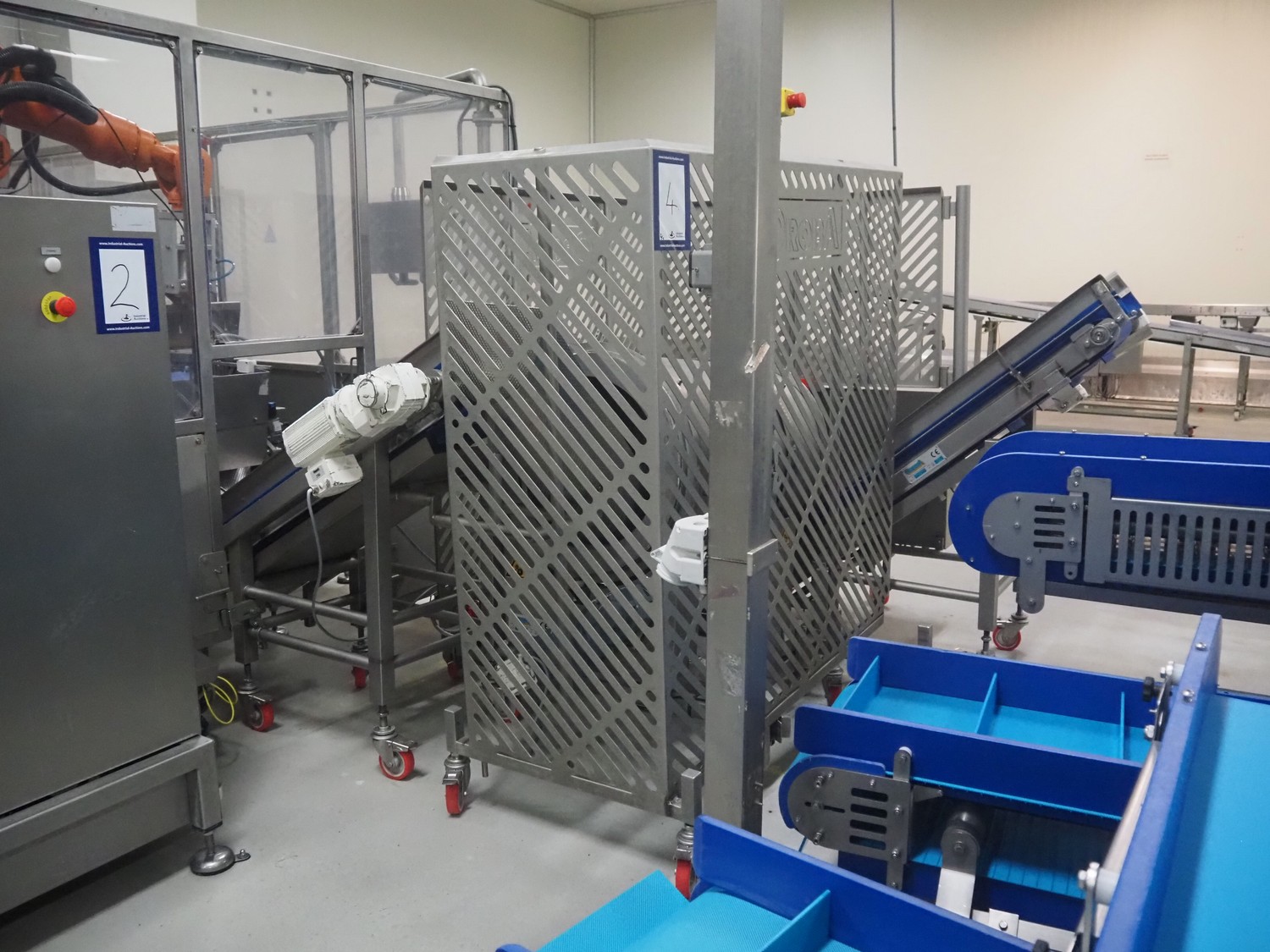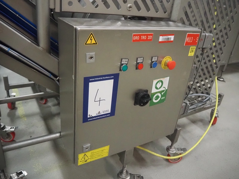 - Outfeed elevating belt, type: TB-304, L=1600-38,5°, number: 122698, year of construction: 2014, machine weight: 150 kg, plastic belt with dividers, belt width: 250 mm, dividers height: 35 mm, distance between dividers: 115 mm, elevating height: 1250 mm, elevating belt dimensions: 1600 mm x 750 mm x 1380 mm, total dimensions: 2740 mm x 2300 mm x 1850 mm.