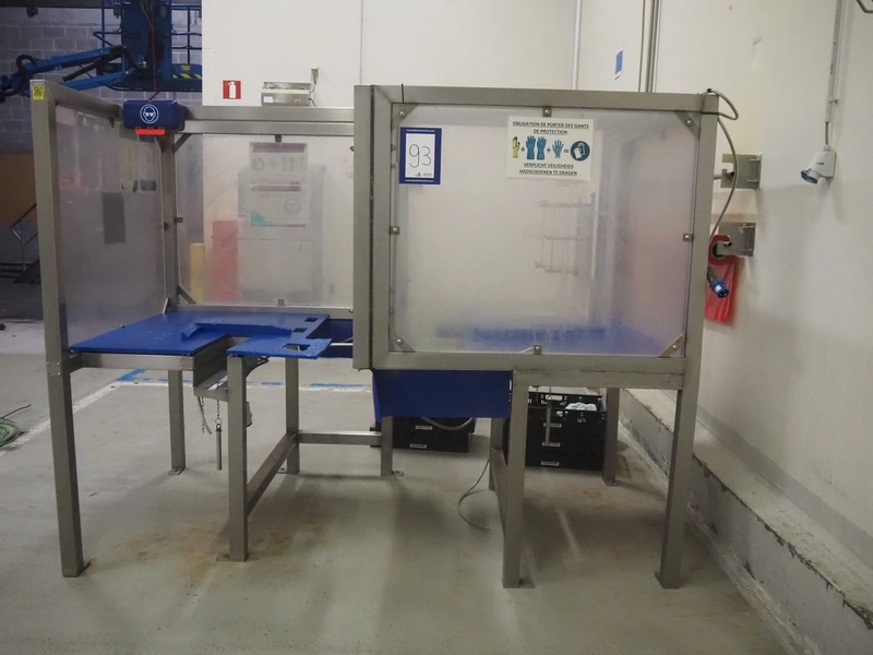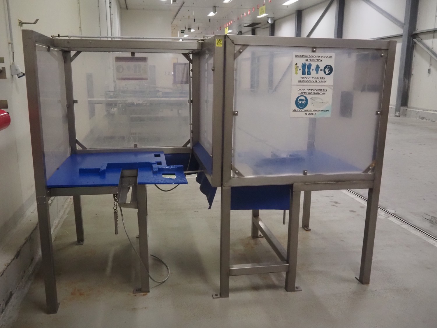 S/s cheese processing station, plastic worktops, chamber dimensions: (2x) 460 mm x 130 mm x 140 mm, total dimensions: 2410 mm x 1280 mm x 1850 mm.