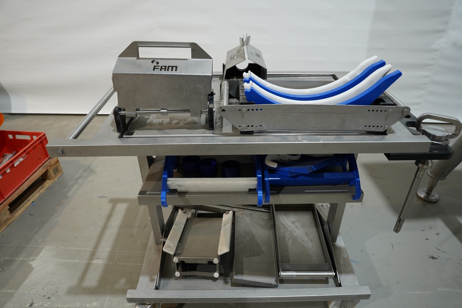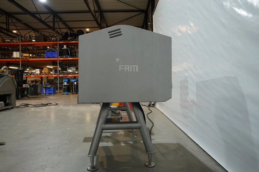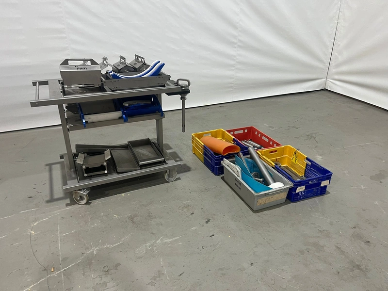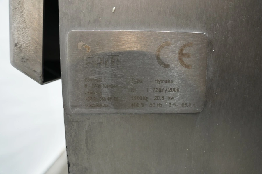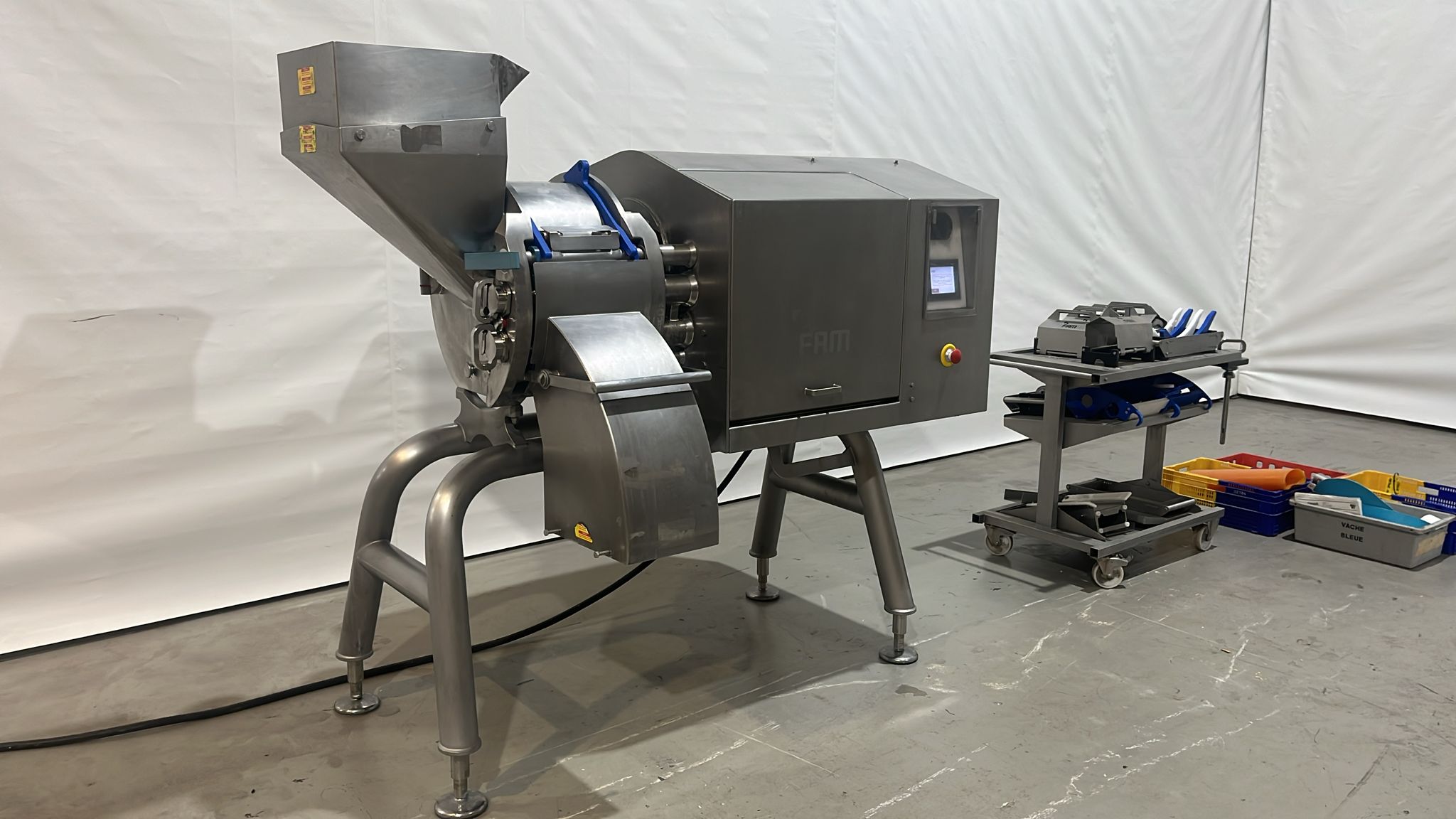 FAM mobile dicer, type: Hymaks, number: 7267, year of construction: 2009, 400 V, 3 Ph, 50 Hz, 20.5 kW, 65.8 A, 1100 kg, dimensions: 2100 mm x 1400 mm x 2000 mm. Including tool trolley, 3 mm and 8 mm knife set and 4 crates with various parts.