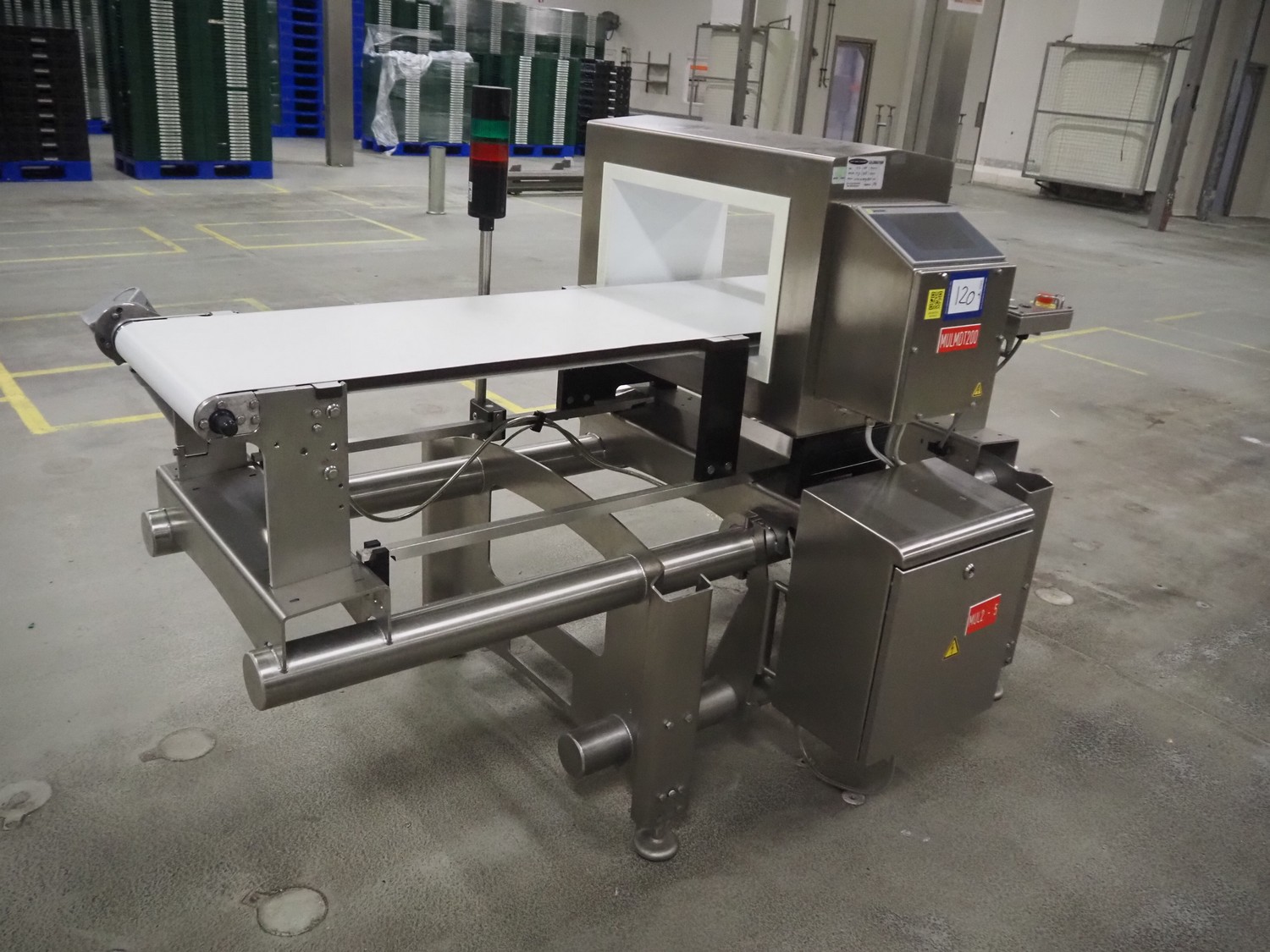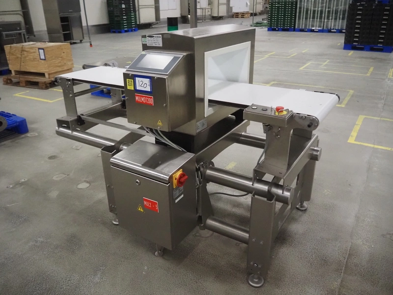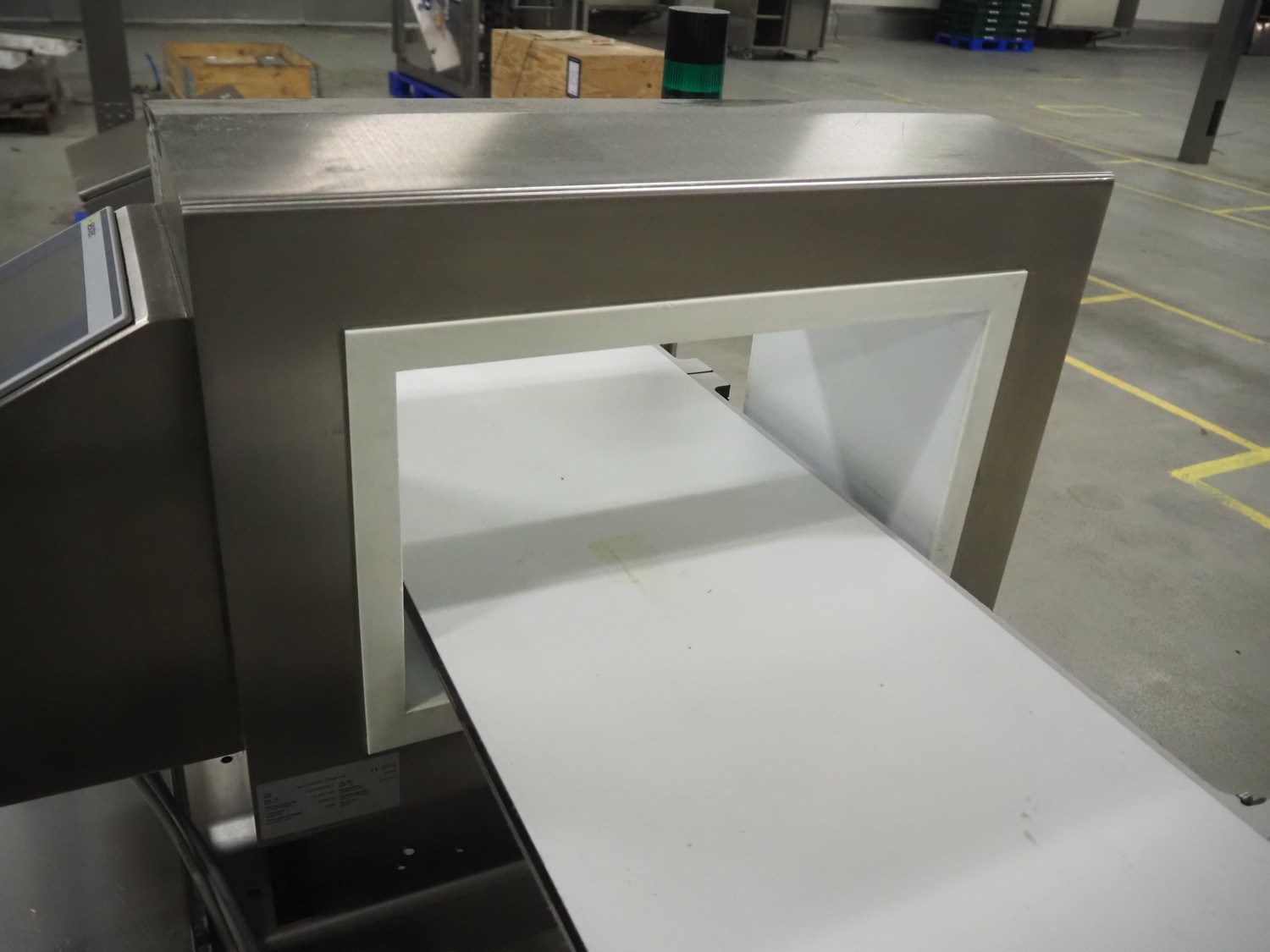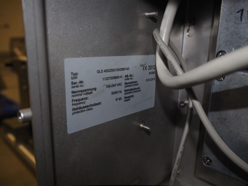 Sesotec metal detector, type: GLS 450/250/125/289/143, serial number: 11227009665-H, year of construction: 2012, 100-240 VAC, 50/60 Hz, 0.5-0.25 A, plastic belt, belt width: 390 mm, clearance: 450 mm x 200 mm, total dimensions: 1750 mm x 1000 mm x 1200 mm.