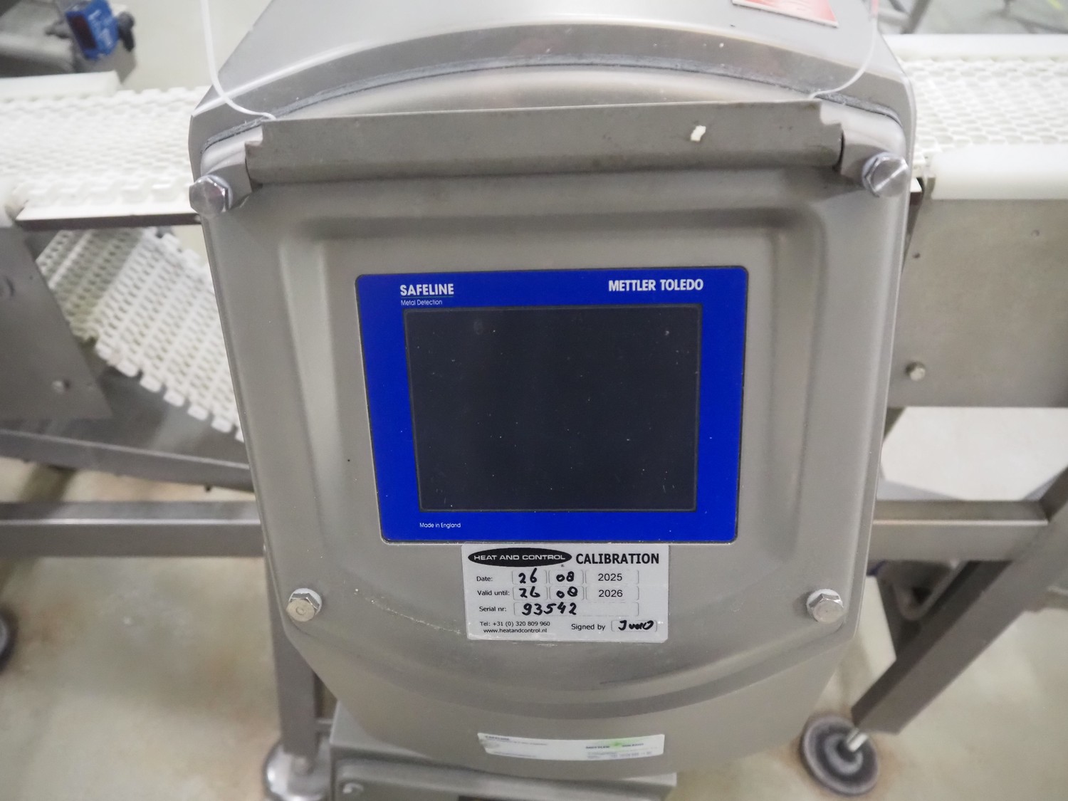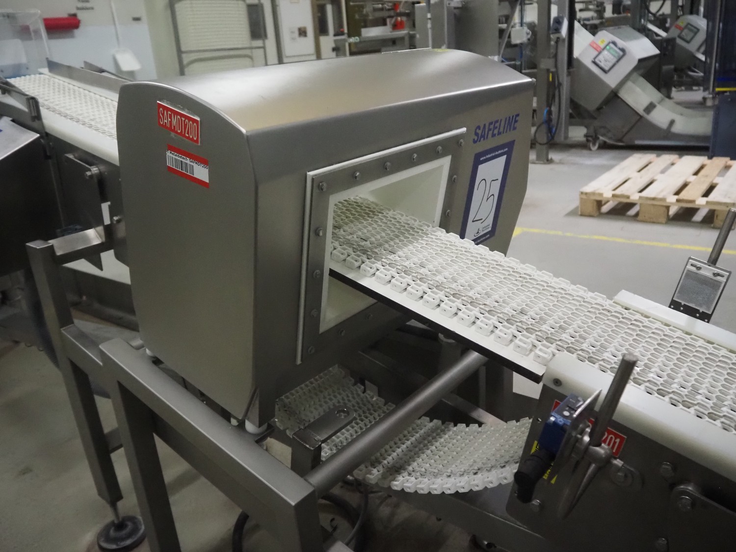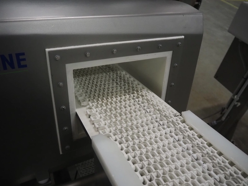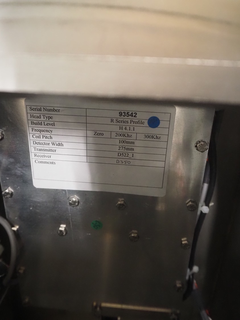 Safeline metal detector on elevating belt, type: R Series Profile, serial number: 93542, plastic mesh belt, belt width: 190 mm, clearance: 750 mm, total dimensions: 4000 mm x 800 mm x 1150 mm.