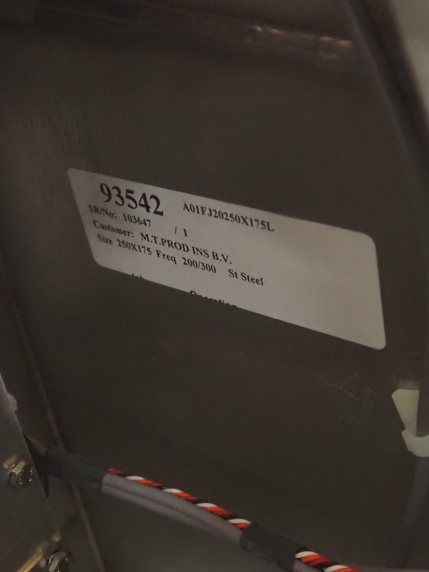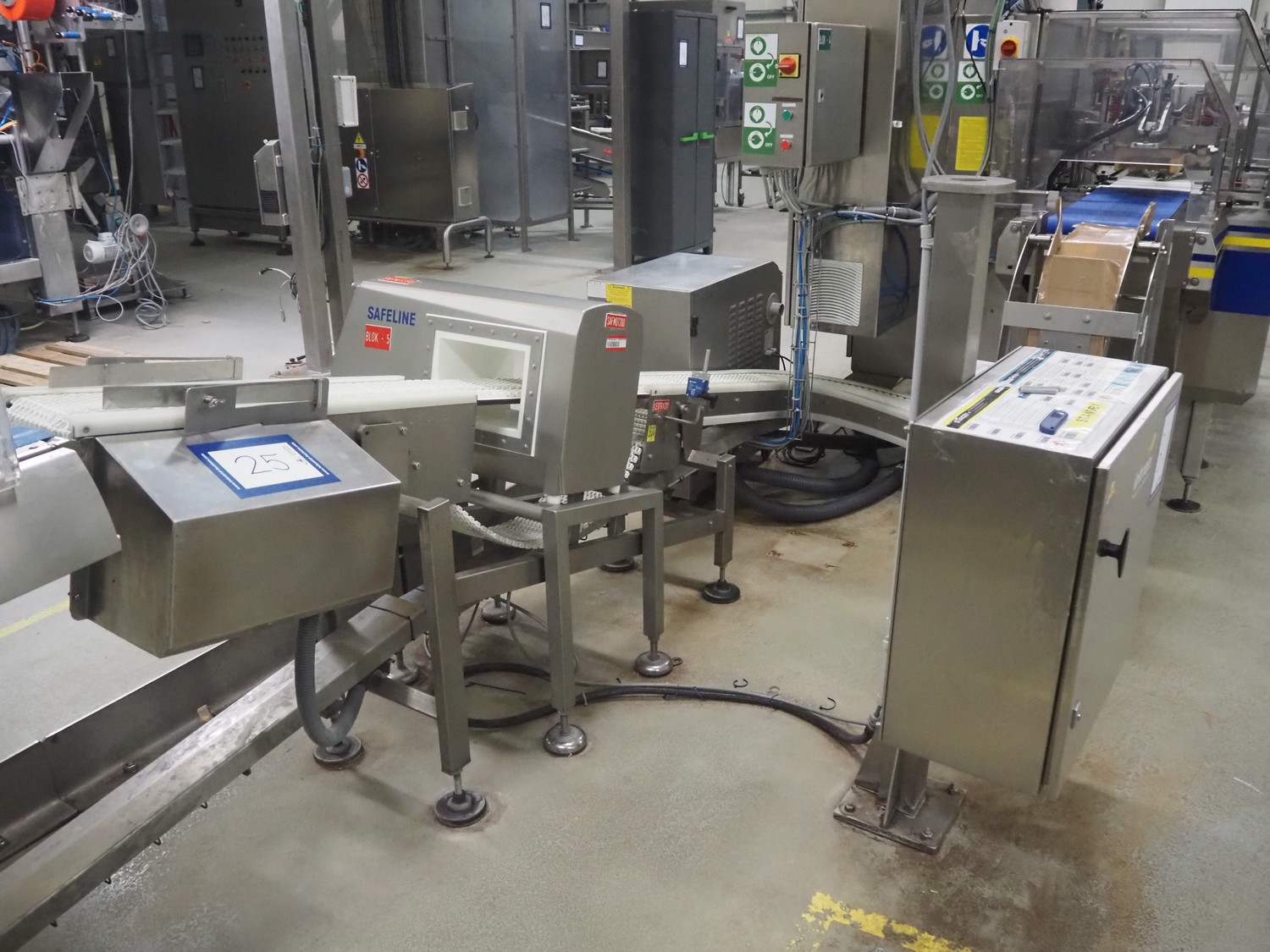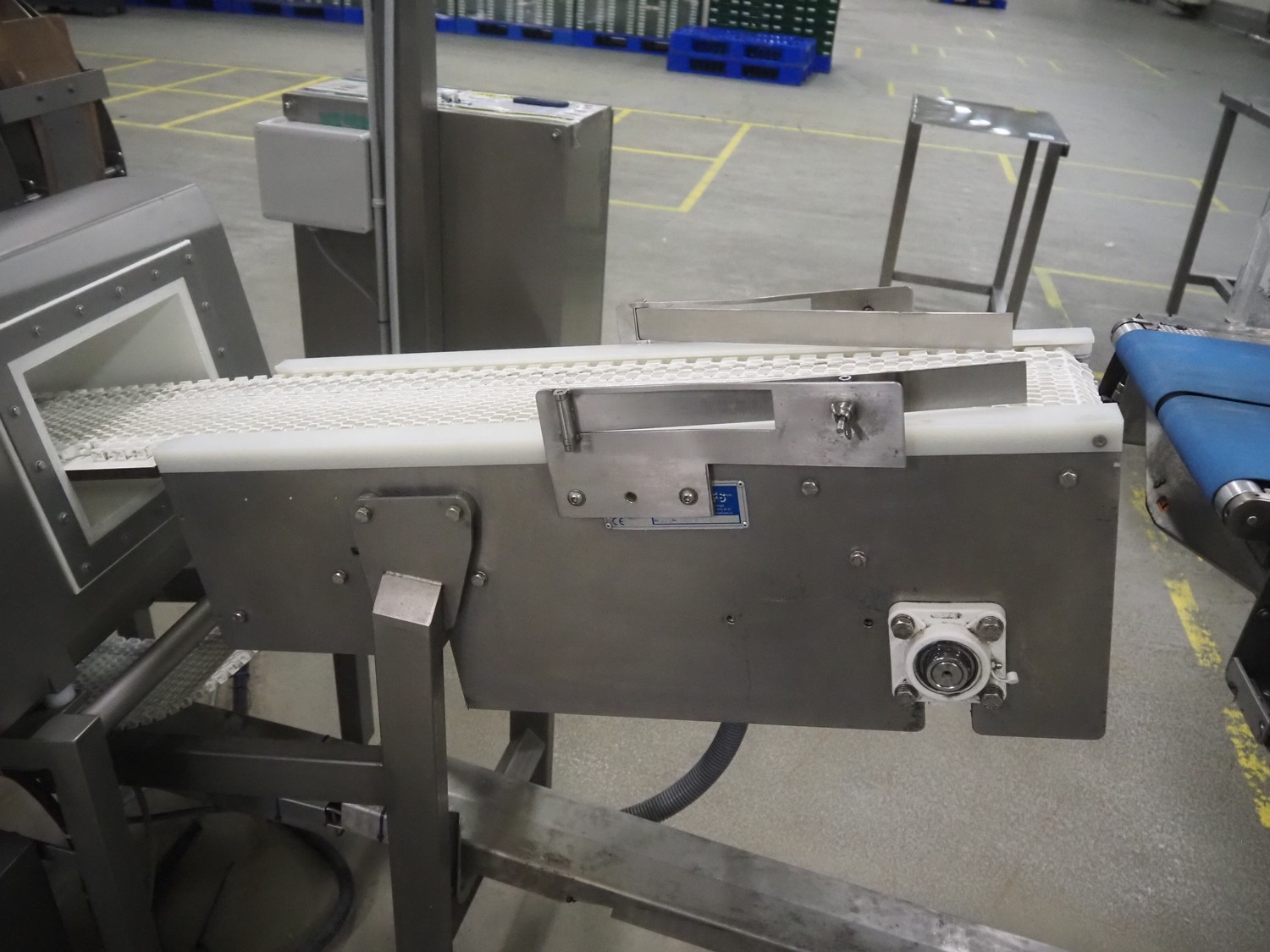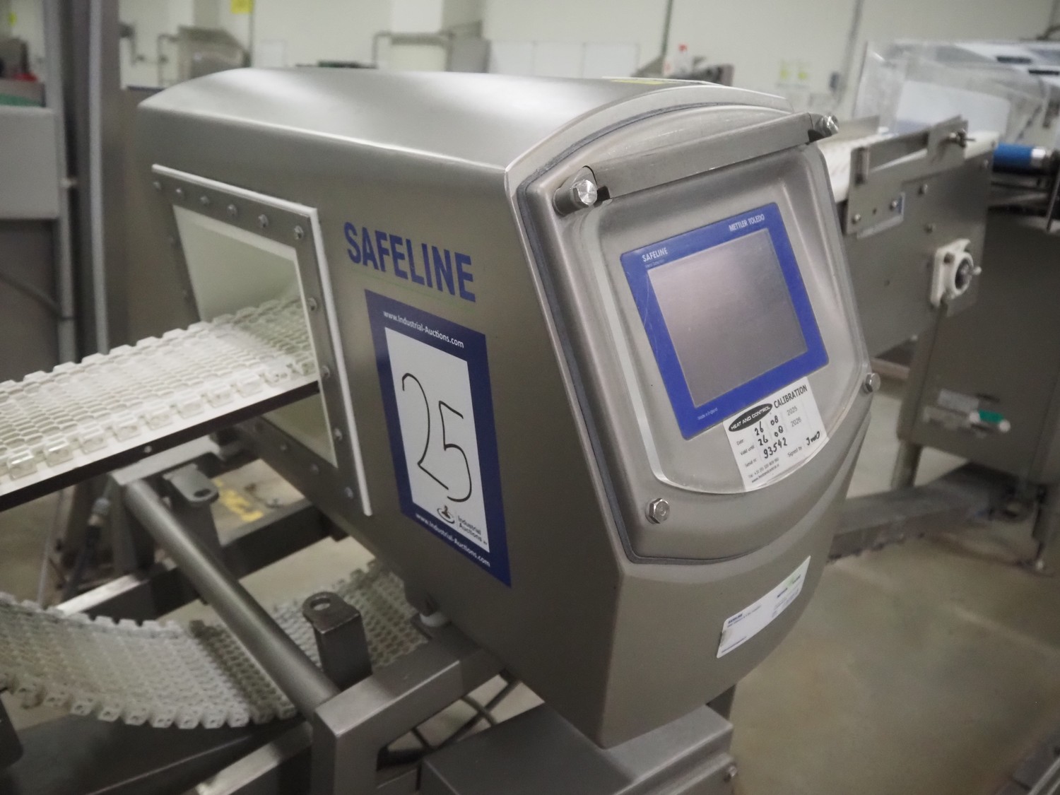 Safeline metal detector on elevating belt, type: R Series Profile, serial number: 93542, plastic mesh belt, belt width: 190 mm, clearance: 750 mm, total dimensions: 4000 mm x 800 mm x 1150 mm.