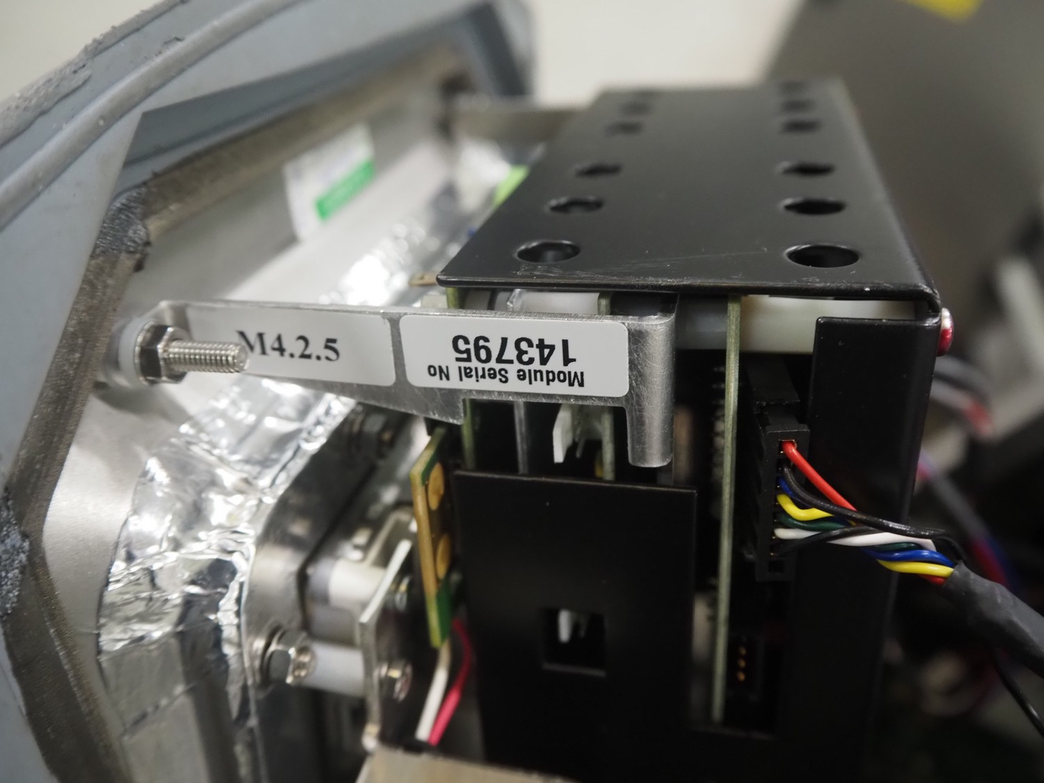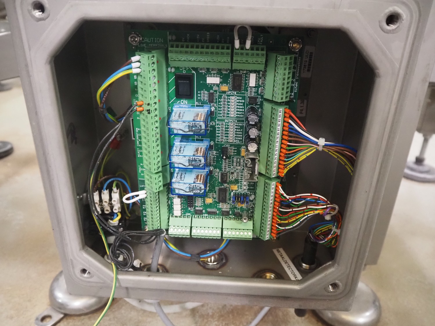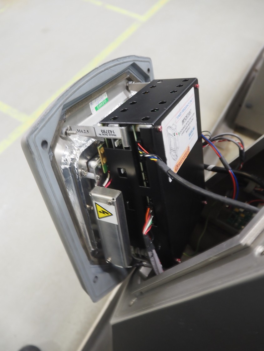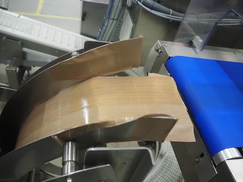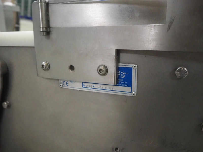 Safeline metal detector on elevating belt, type: R Series Profile, serial number: 93542, plastic mesh belt, belt width: 190 mm, clearance: 750 mm, total dimensions: 4000 mm x 800 mm x 1150 mm.