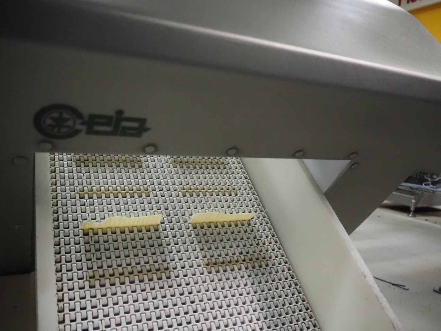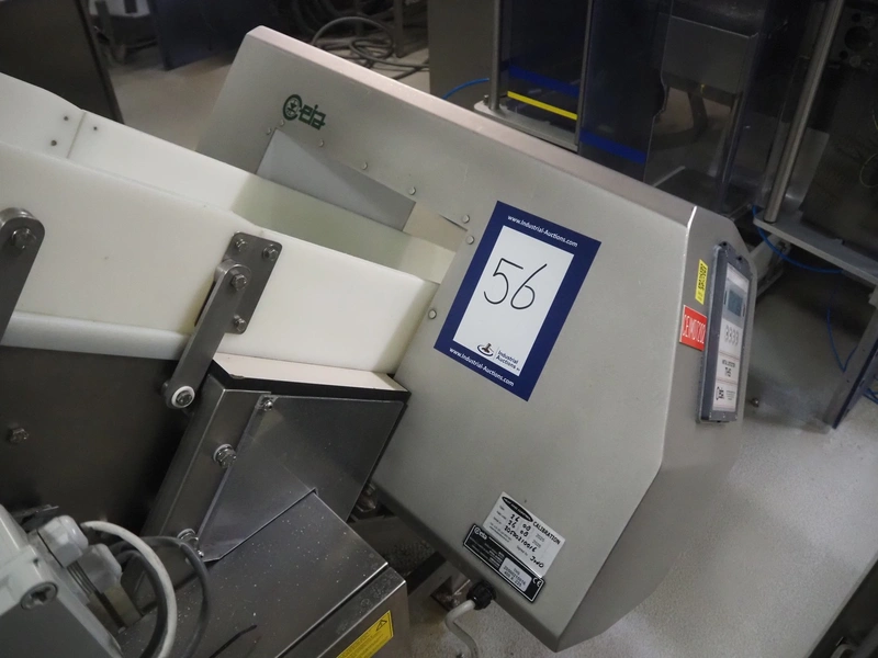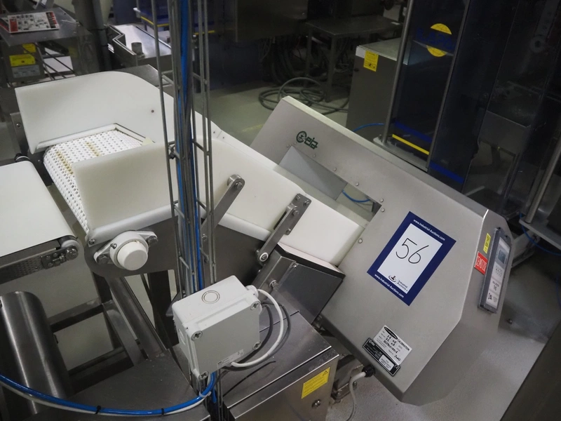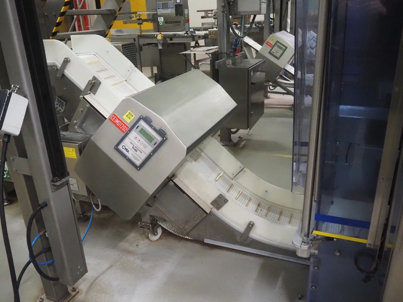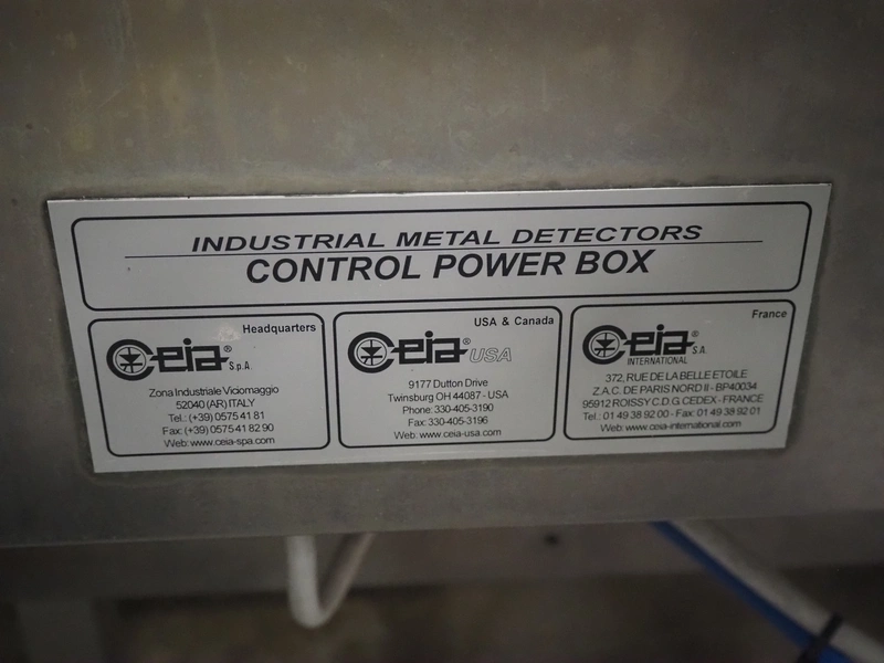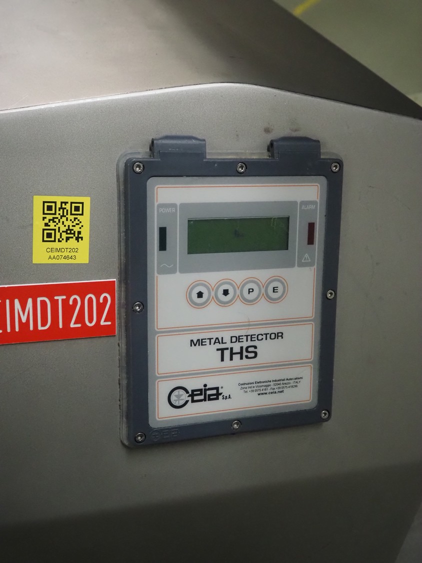 Ceia metal detector on elevating belt, model: THS, serial number: 20500210016, plastic mesh belt with dividers, belt width: 330 mm, dividers height: 25 mm, distance between dividers: 210 mm, clearance: 400 mm x 200 mm, elevating height: 1100 mm, total dimensions: 2300 mm x 900 mm x 1250 mm.