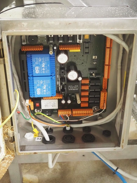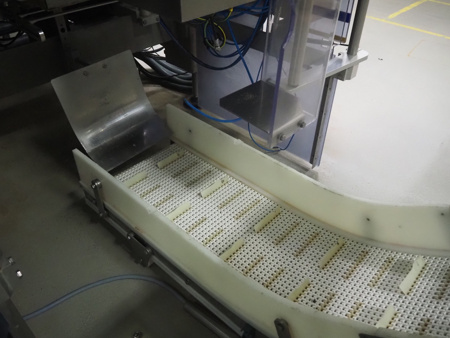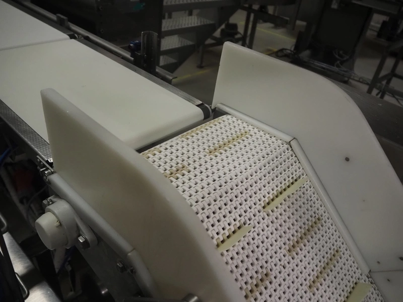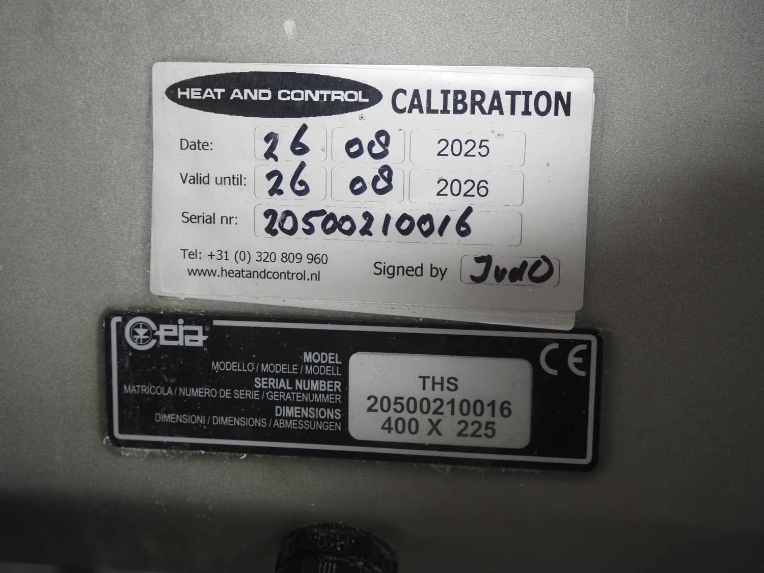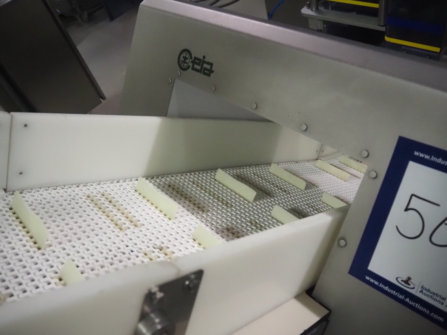 Ceia metal detector on elevating belt, model: THS, serial number: 20500210016, plastic mesh belt with dividers, belt width: 330 mm, dividers height: 25 mm, distance between dividers: 210 mm, clearance: 400 mm x 200 mm, elevating height: 1100 mm, total dimensions: 2300 mm x 900 mm x 1250 mm.