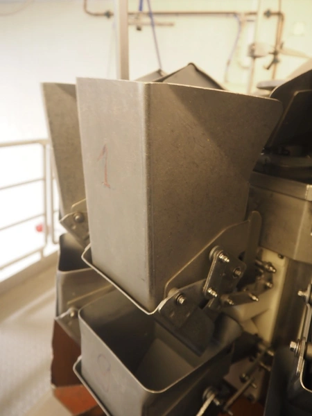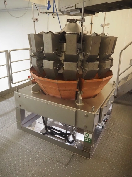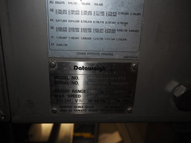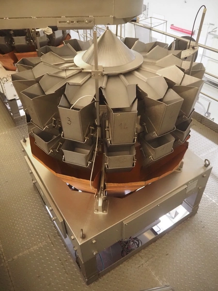 Yamato 14-heads multihead weigher, model: ADW-514SW, serial number: WG051006, 220/240 V, 1 Ph, 50/60 Hz, 10 A, weight range: 20 g - 2000 g, each basket: 120 mm x 140 mm x 290 mm, total dimensions: 1250 mm x 1250 mm x 1850 mm.