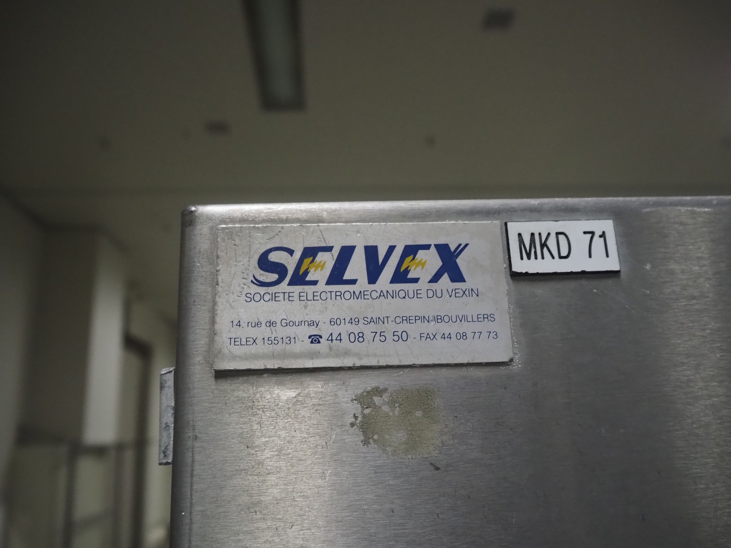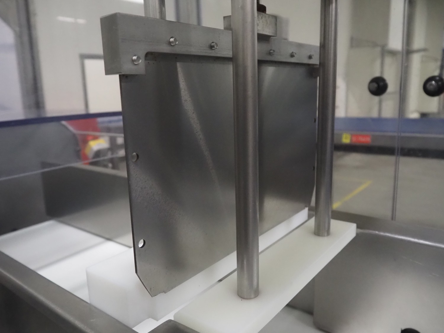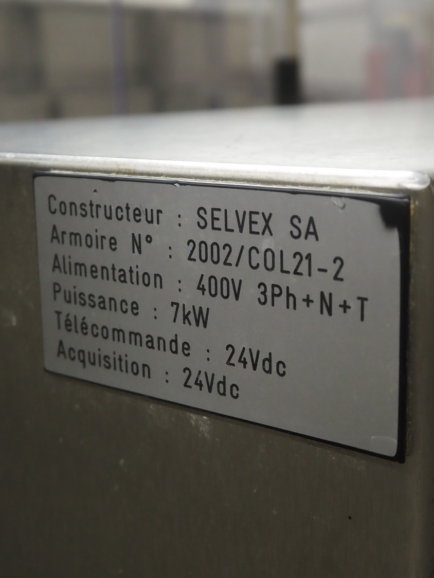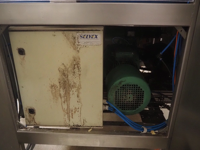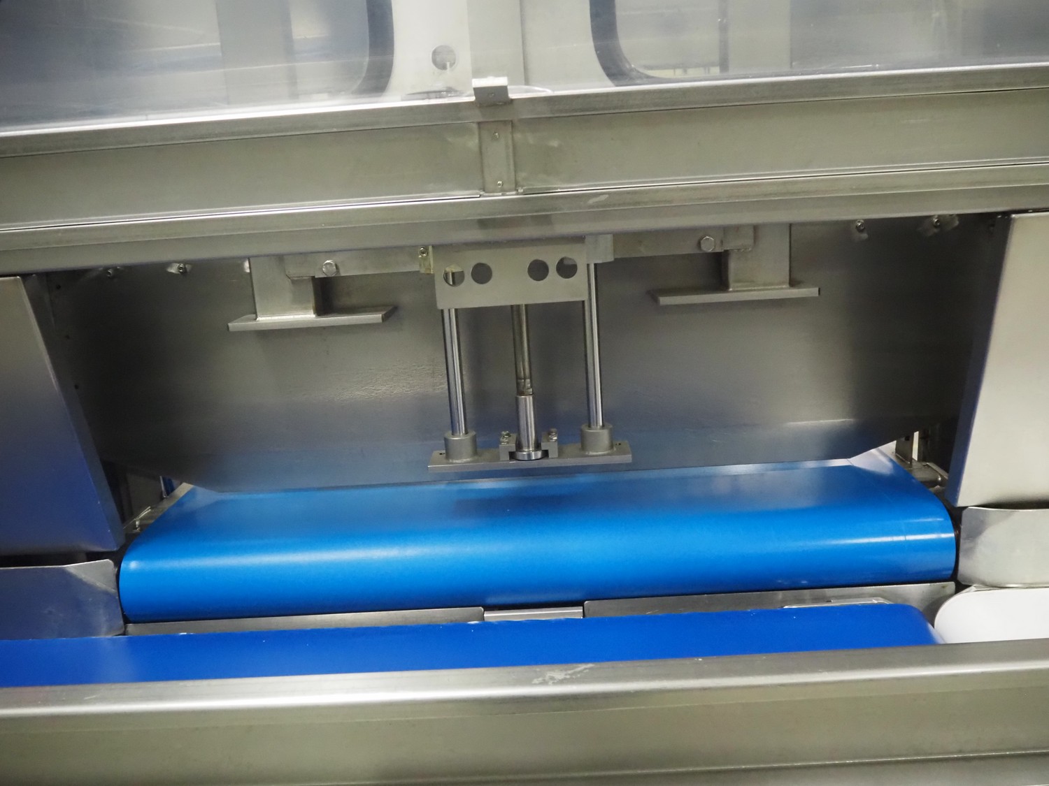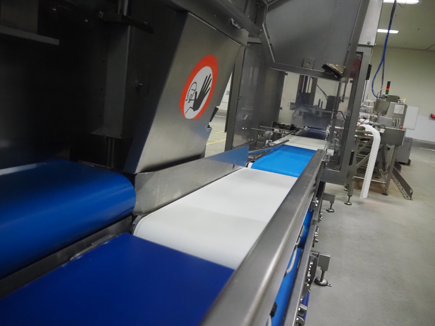 Selvex SA portioning machine, number: COL21-2, year of construction: 2002, 400 V, 3 Ph, 7 kW, infeed plastic belt, belt width: 1000 mm, clearance: 1230 mm x 500 mm, knive width: (1x) 1060 mm (1x) 340 mm, plastic belt, belt width: 350 mm, total dimensions: 2150 mm x 5000 mm x 2100 mm.