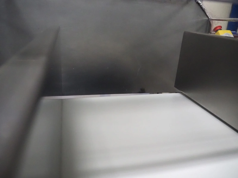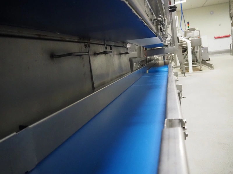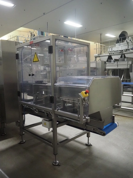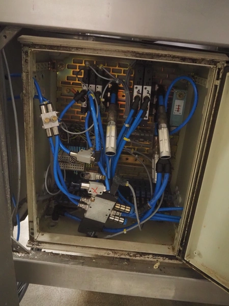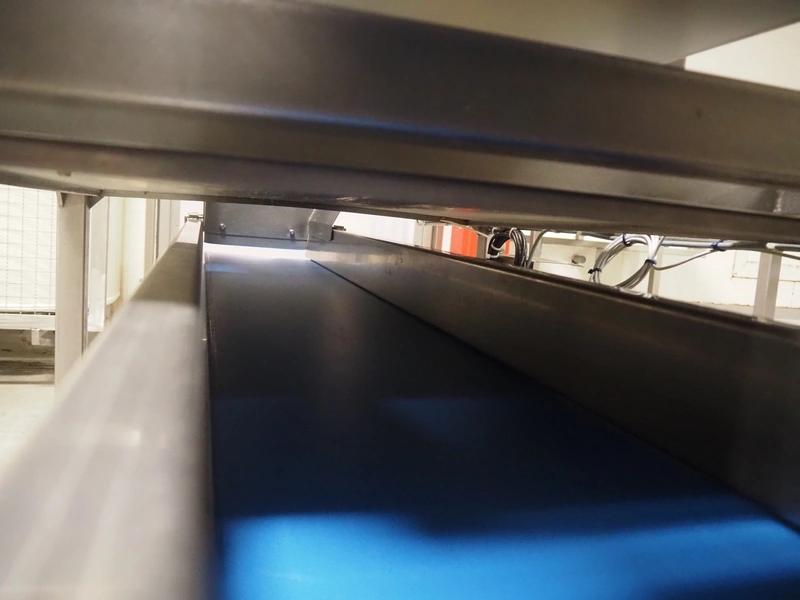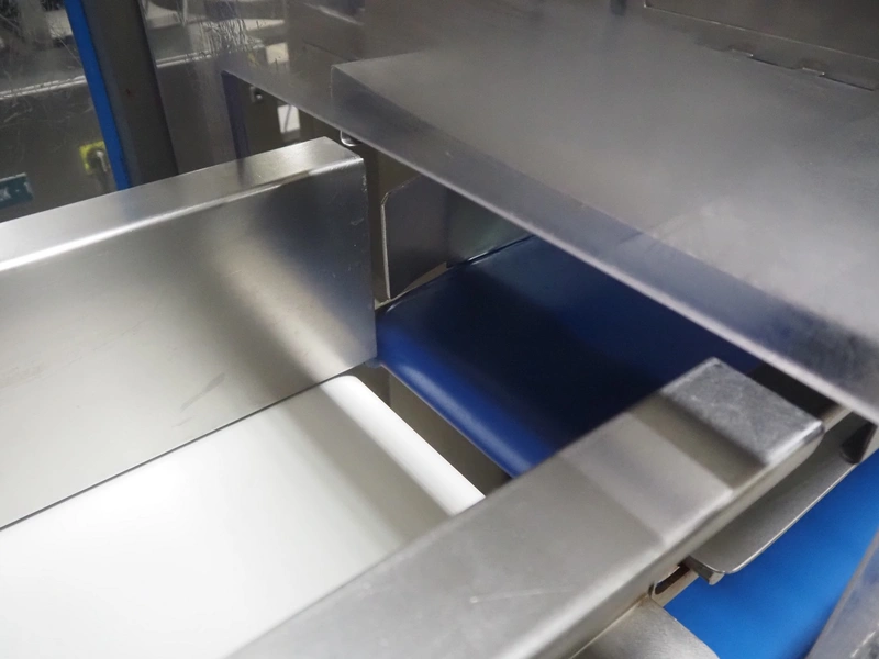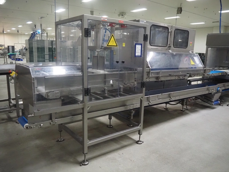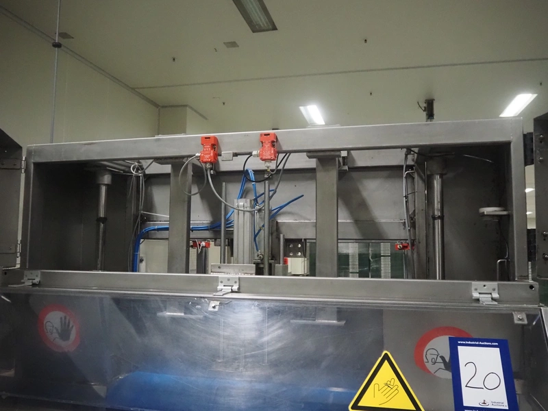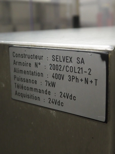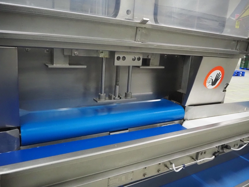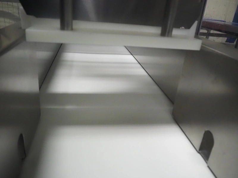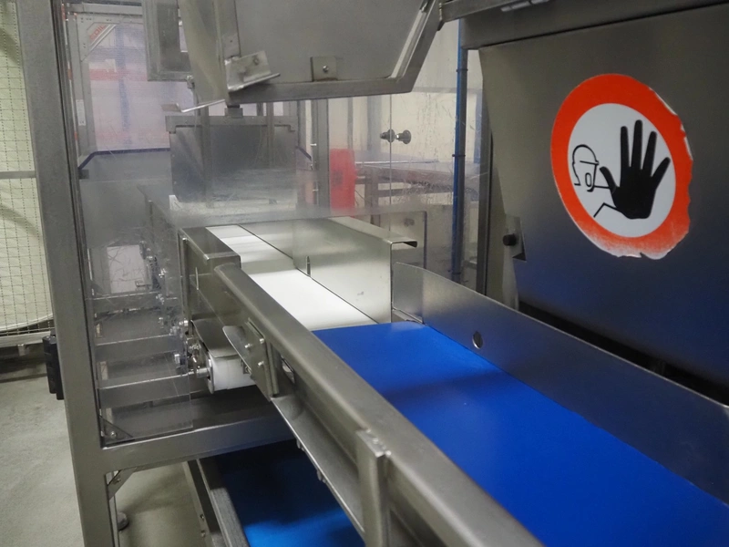 Selvex SA portioning machine, number: COL21-2, year of construction: 2002, 400 V, 3 Ph, 7 kW, infeed plastic belt, belt width: 1000 mm, clearance: 1230 mm x 500 mm, knive width: (1x) 1060 mm (1x) 340 mm, plastic belt, belt width: 350 mm, total dimensions: 2150 mm x 5000 mm x 2100 mm.