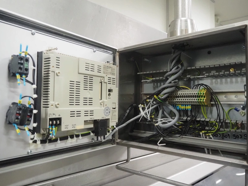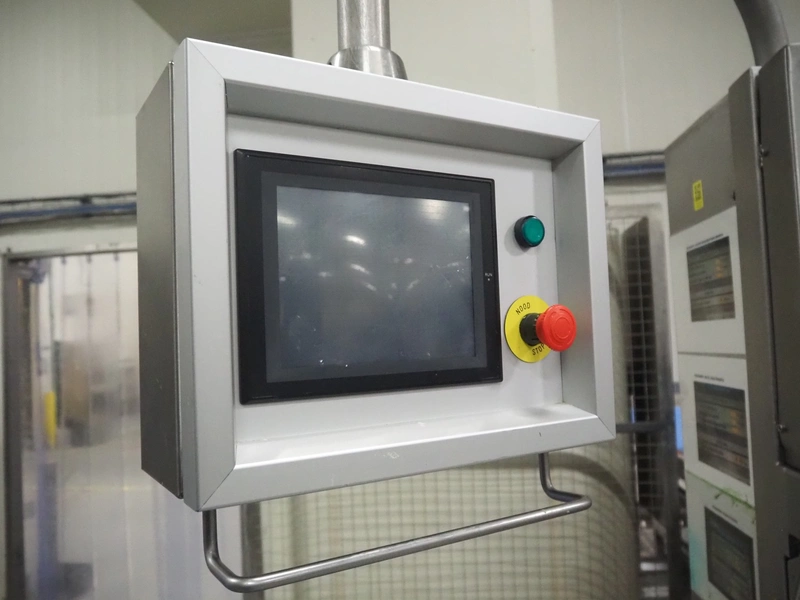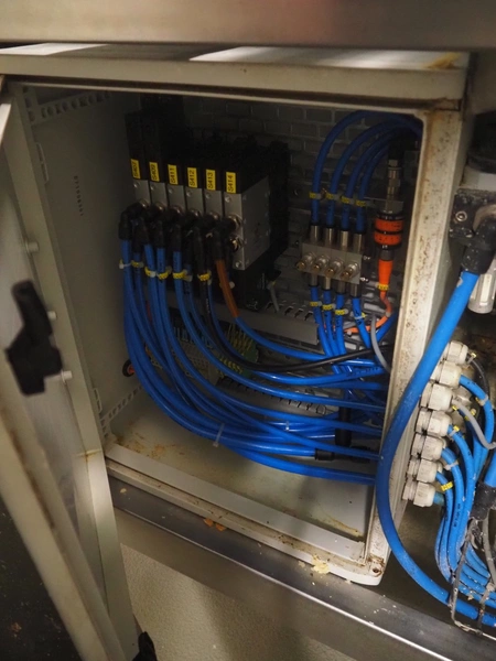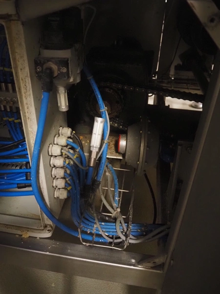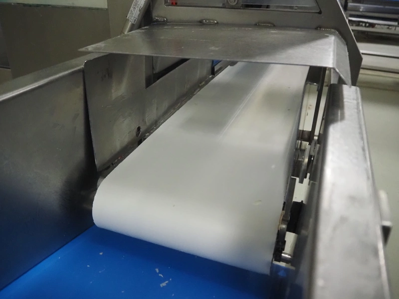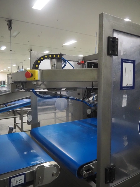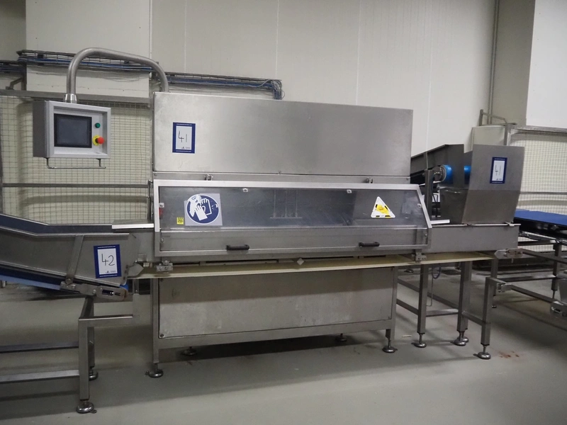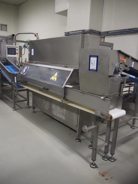 Portioning machine, plastic belt, belt width: (1x) 1000 mm and (1x) 300 mm, clearance: 1260 mm x 420 mm, knive width: 1200 mm, total dimensions: 2100 mm x 3060 mm x 2200 mm.