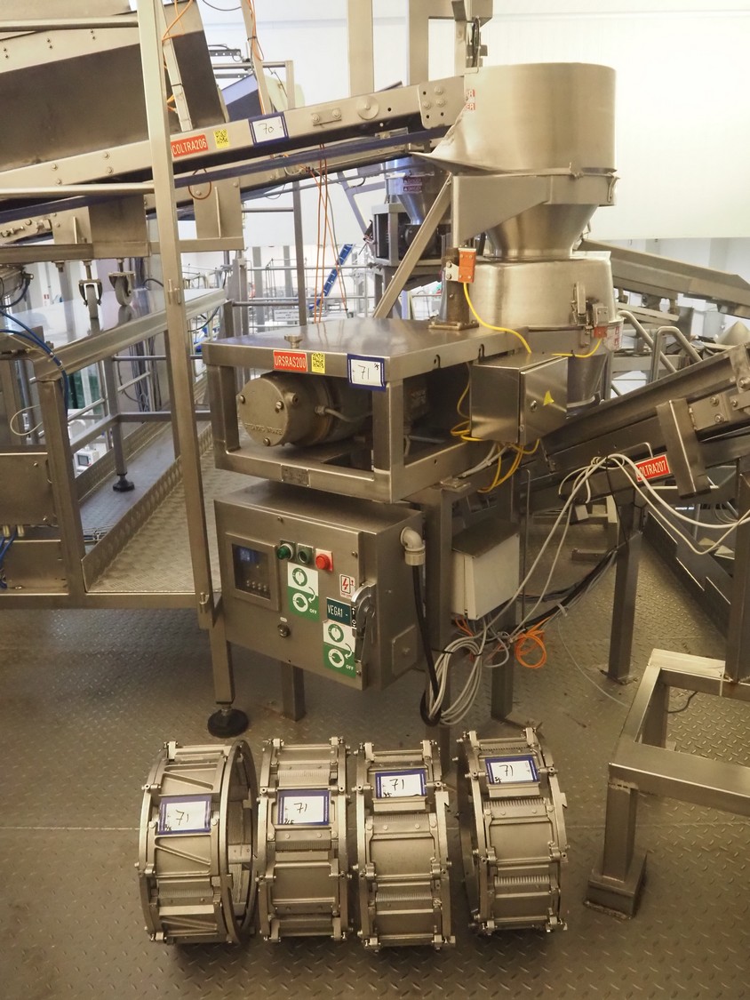 Urschel slicer/shredder, model: CC, serial number: 3947, year of construction: 1999, infeed diameter: 450 mm, knive diameter: 410 mm, knive width: 100 mm, total dimensions: 1550 mm x 1300 mm x 2240 mm. Including 3 extra knives.