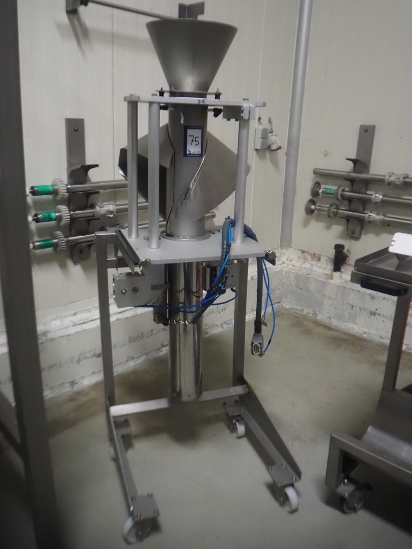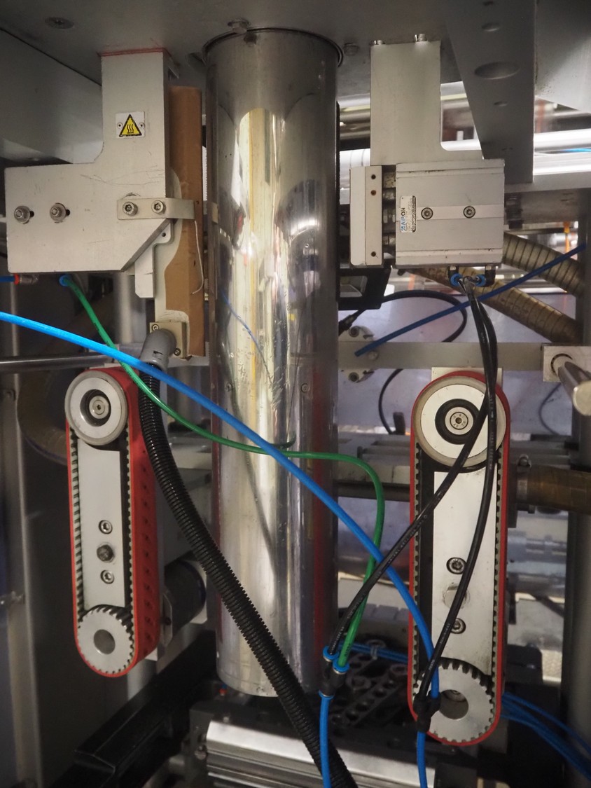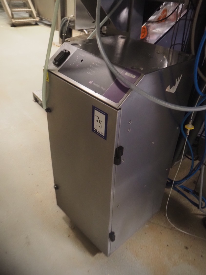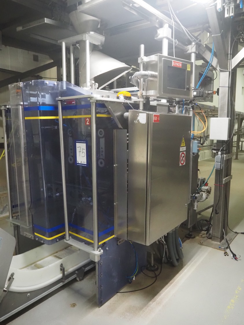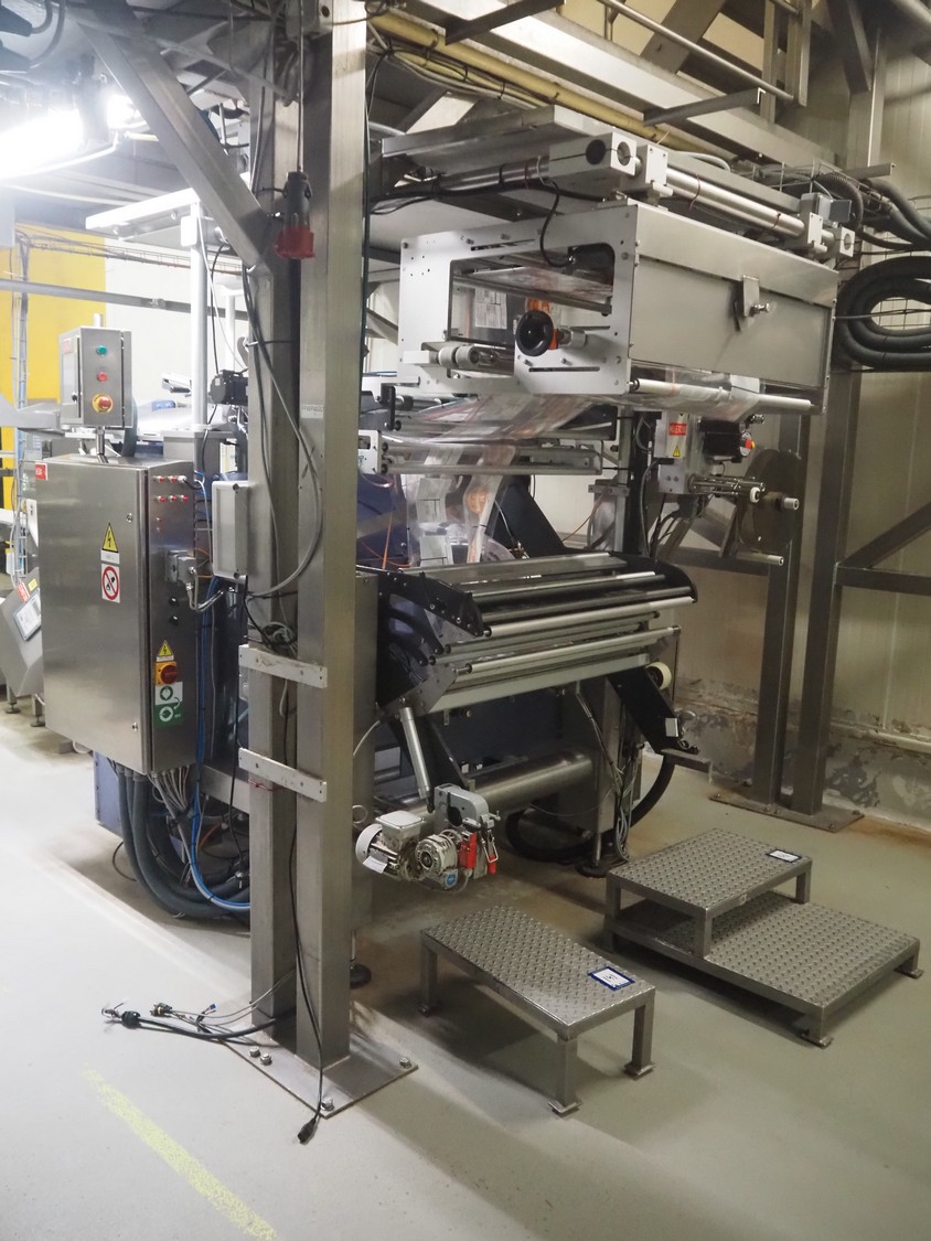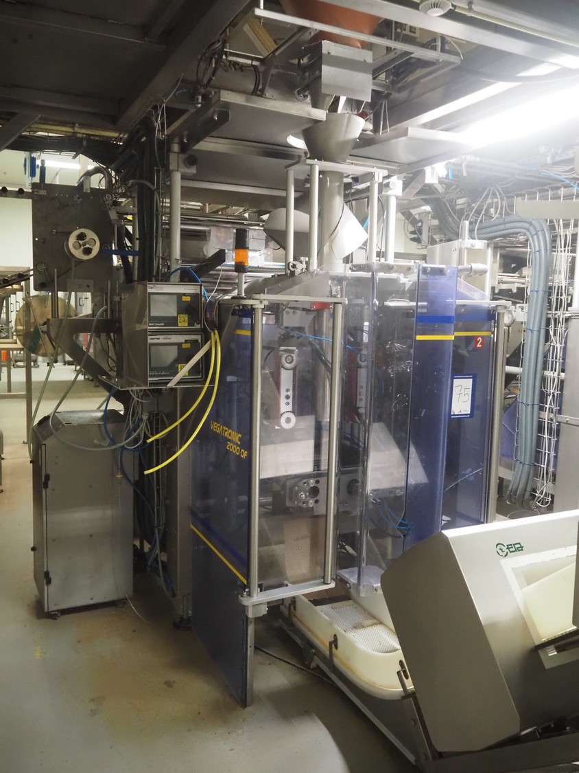 Ilapak vertical bag form-, fill-, and seal machine, model: Vegatronic 2000 OF, serial number: 0741812002, 400 V, 3 Ph, 50 Hz, 17 A, filling pipe: Ø 120 mm, vertical seal length: 270 mm, horizontal seal length: 320 mm, film width: 470 mm, total dimensions: 2700 mm x 2350 mm x 2450 mm. Markem smartlaser unit, model: ES500, serial number: 05/13/ES500-960, year of construction: 05/2013, 230 V, 50/60 Hz, 12.5 A, dimensions: 440 mm x 430 mm x 980 mm, switch cabinet: 1450 mm x 600 mm x 1330 mm, 2 extra filling pipes: Ø 80 mm and 130 mm, trolley for filling pipe, dimensions: 580 mm x 640 mm x 1000 mm, trolley with film holders, film holder width: (3x) 1320 mm, dimensions trolley: 960 mm x 650 mm x 1040 mm.