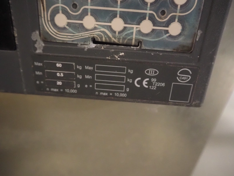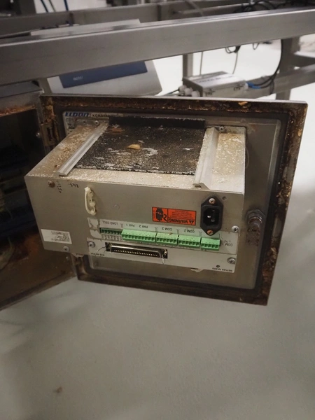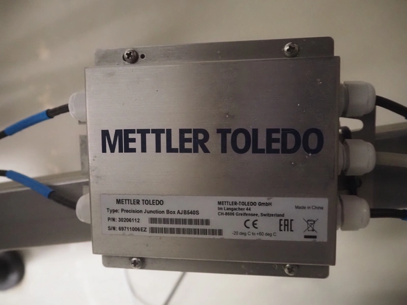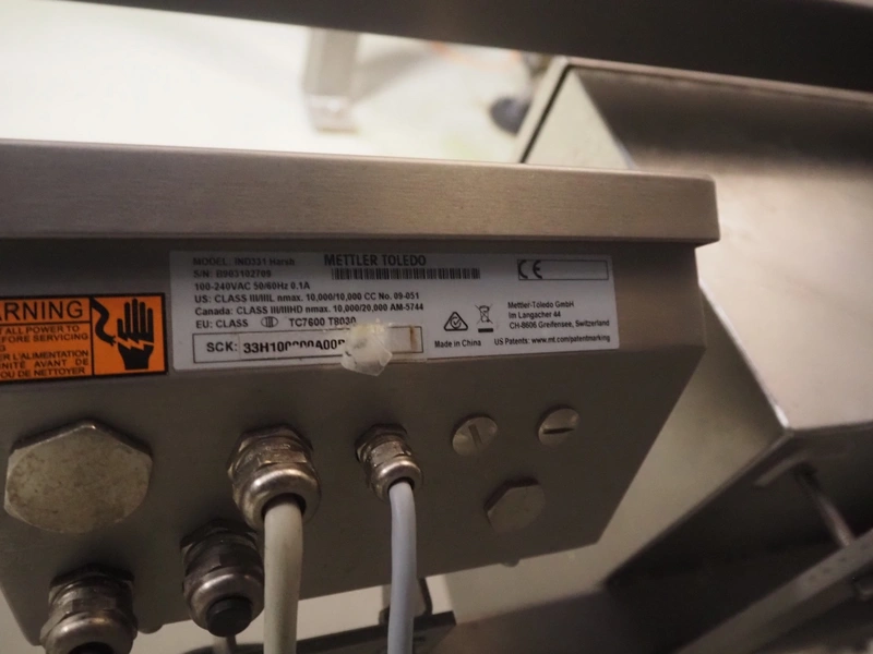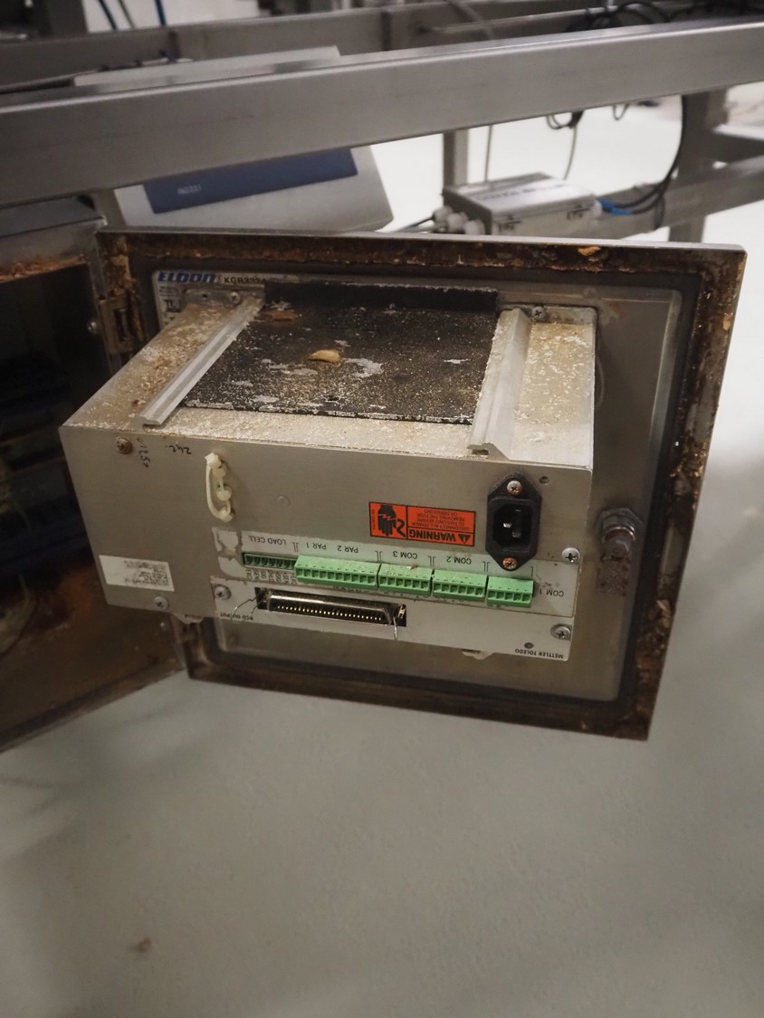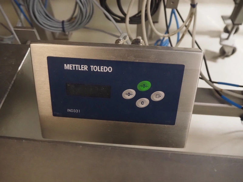 Weighing transport belt with Mettler Toledo indicator, indicator model: IND331 Harsh, serial number: B903102709, 100/240 V, 50/60 Hz, 0.1 A, plastic belt, belt width: 370 mm, total dimensions: 3600 mm x 630 mm x 1810 mm.