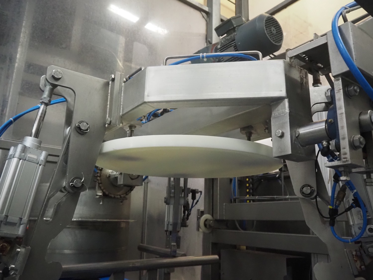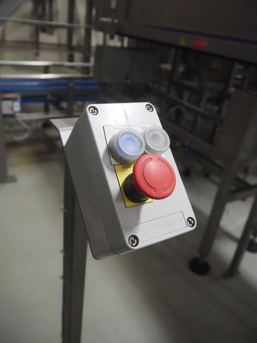 Transport system with bin press, plastic belts, belt width: (4x) 630 mm, diameter press: 630 mm, total dimensions: 3800 mm x 3950 mm x 3100 mm.
