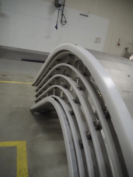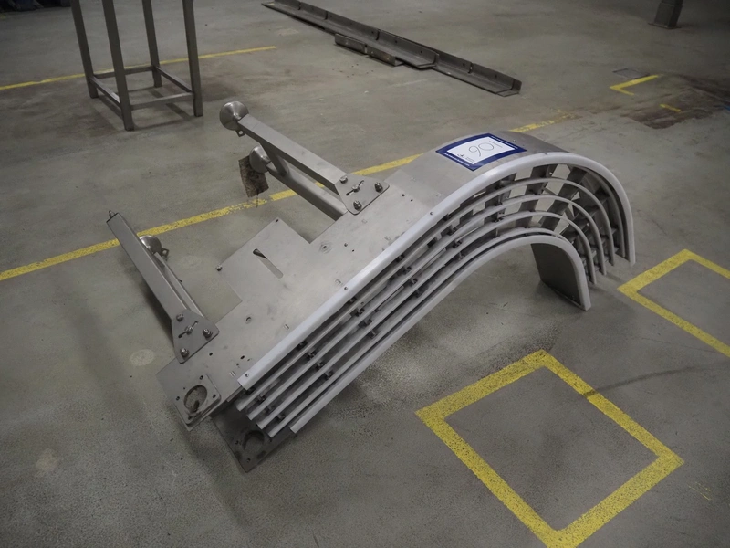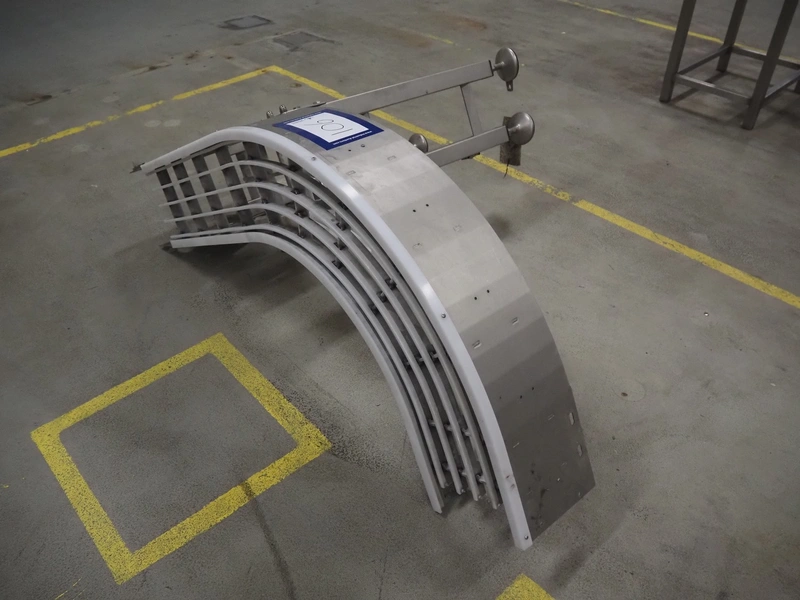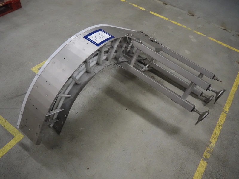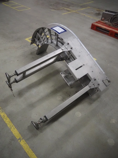S/s 90° curve conveyor, belt width: 220 mm, total dimensions: 1450 mm x 600 mm x 1050 mm. Missing belt.