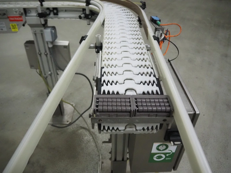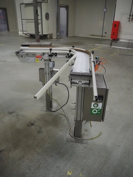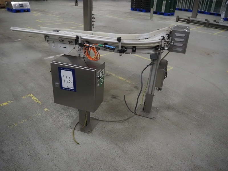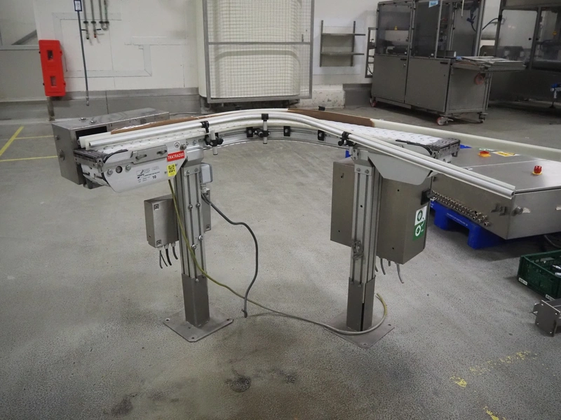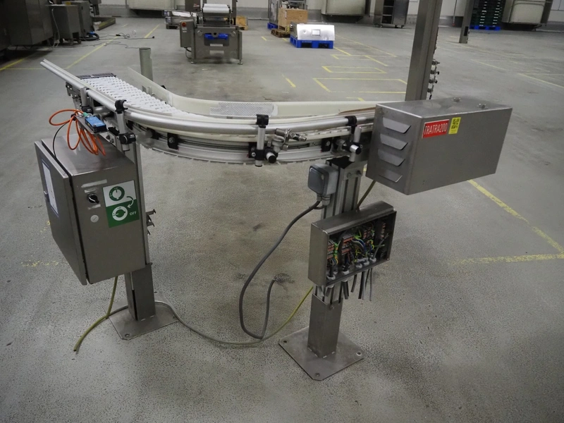 Trapo 90° curve conveyor, year of construction: 03/2013, plastic mesh belt, belt width: 140 mm, total dimensions: 1250 mm x 1200 mm x 930 mm.