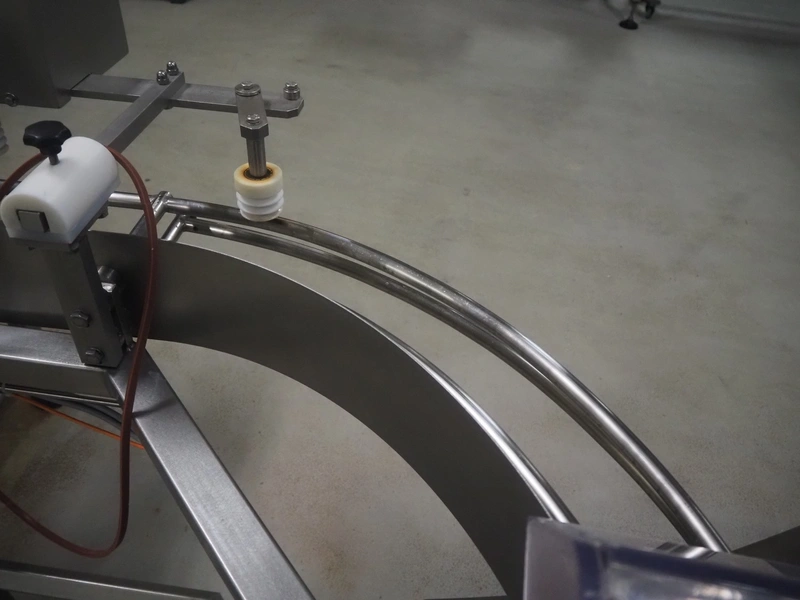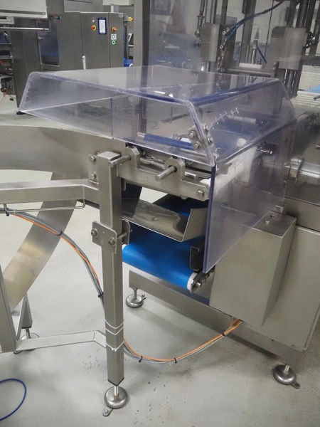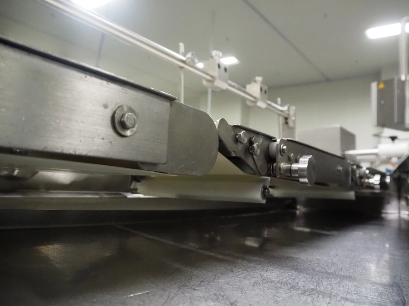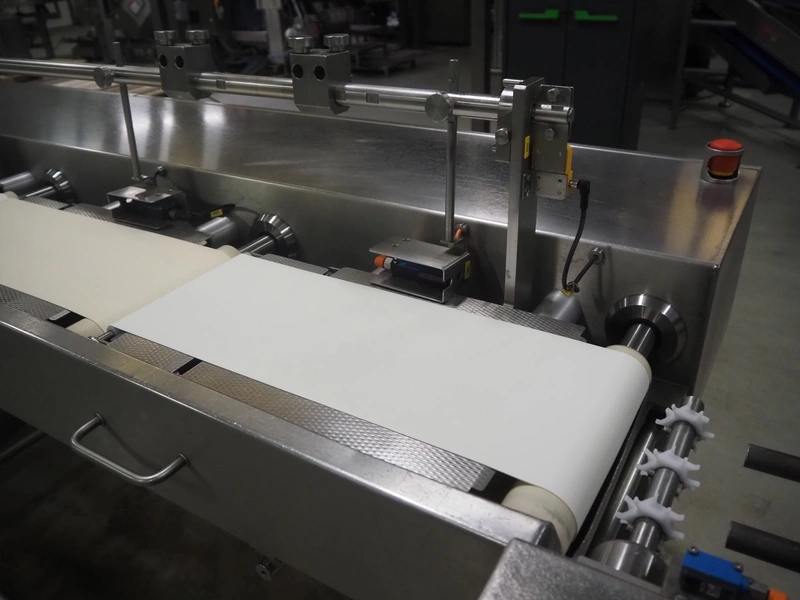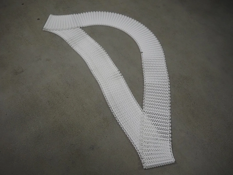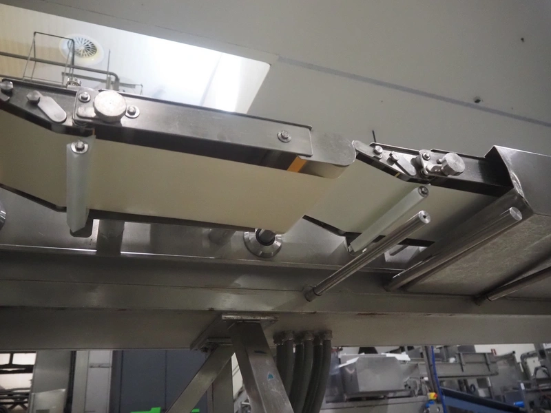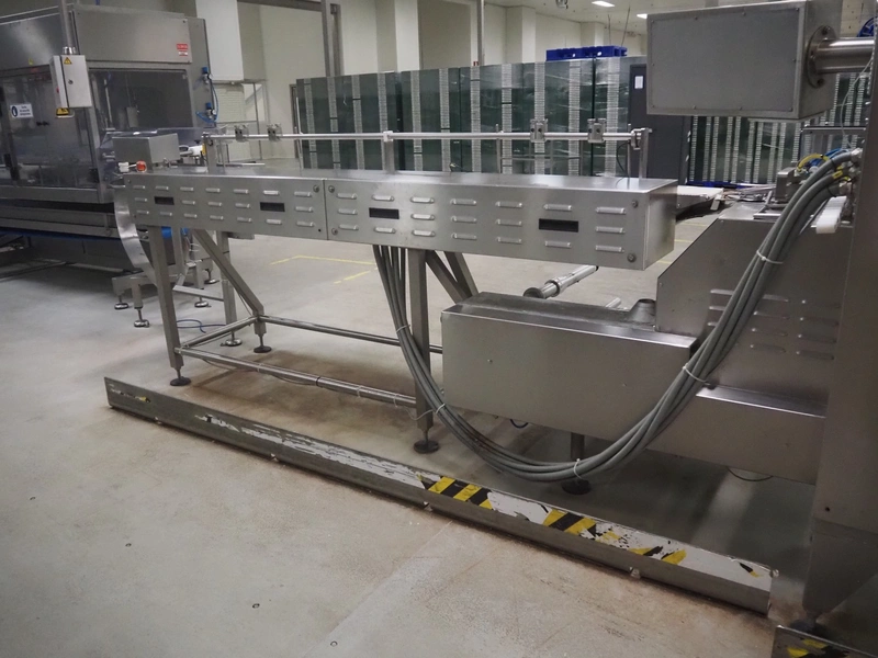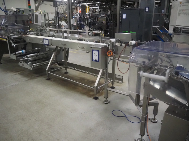 Buffer belt with 90° infeed curve conveyor, plastic mesh belt, belt width: 190 mm, 5 stations, plastic belt, belt width: (5x) 200 mm, dimensions infeed belt: 1270 mm x 1360 mm x 1260 mm, dimensions buffer belt: 2650 mm x 780 mm x 1300 mm.