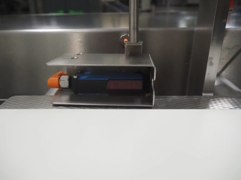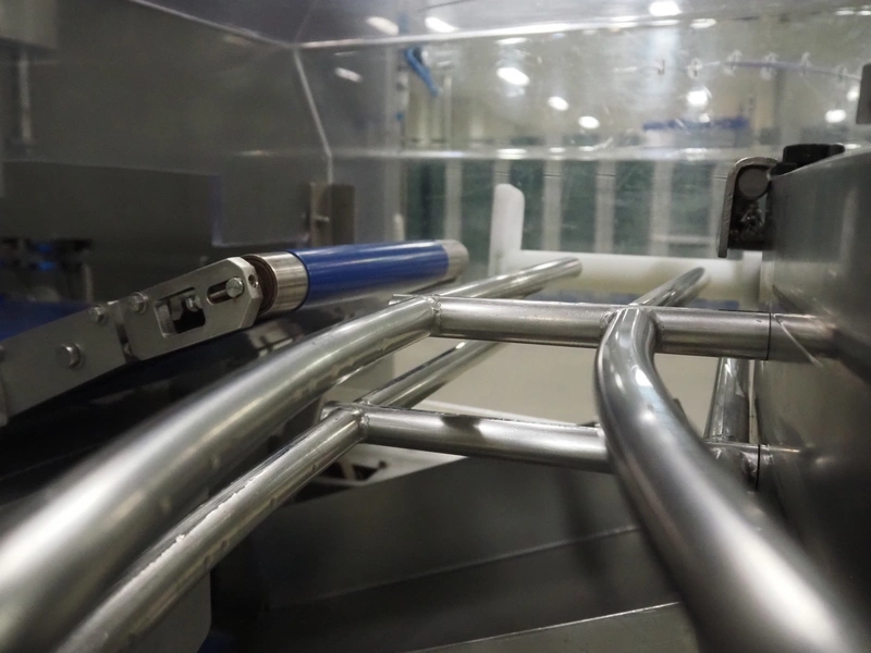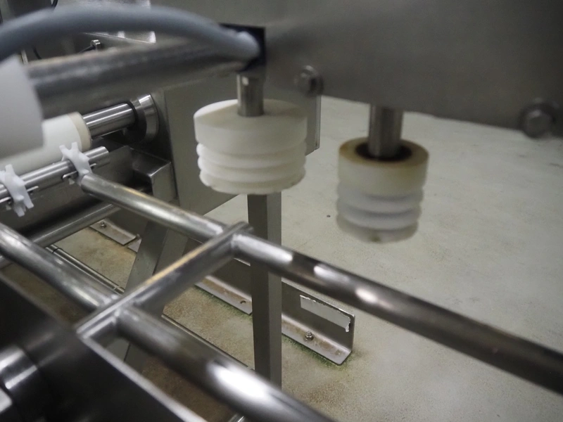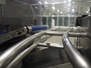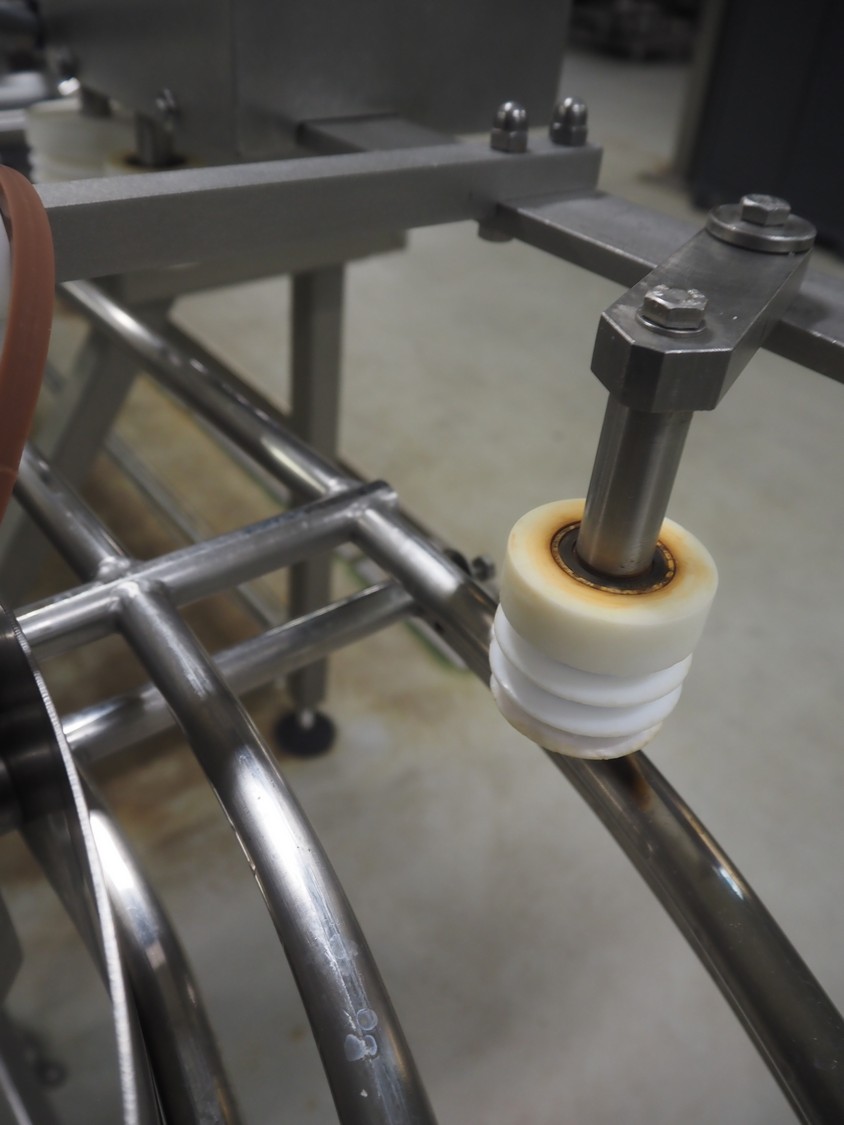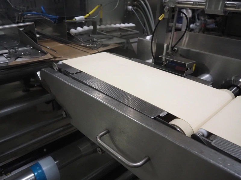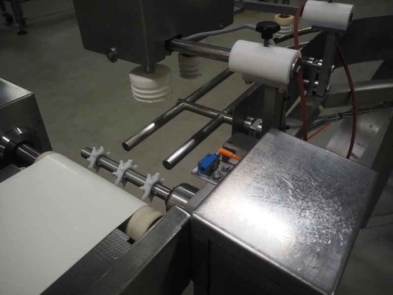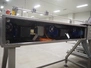 Buffer belt with 90° infeed curve conveyor, plastic mesh belt, belt width: 190 mm, 5 stations, plastic belt, belt width: (5x) 200 mm, dimensions infeed belt: 1270 mm x 1360 mm x 1260 mm, dimensions buffer belt: 2650 mm x 780 mm x 1300 mm.