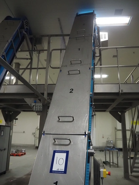 Elevating belt, s/s frame, plastic belt with dividers, belt width: 400 mm, dividers height: 80 mm, distance between dividers: 250 mm, elevating height: 4650 mm, total dimensions: 5450 mm x 880 mm x 4760 mm.