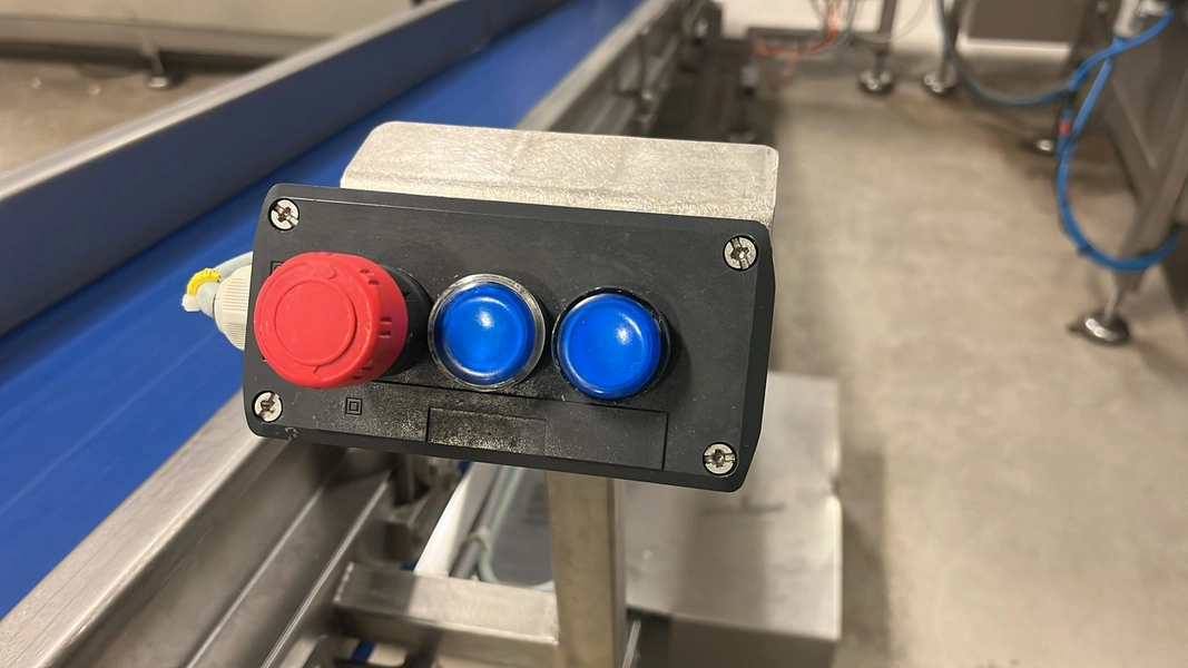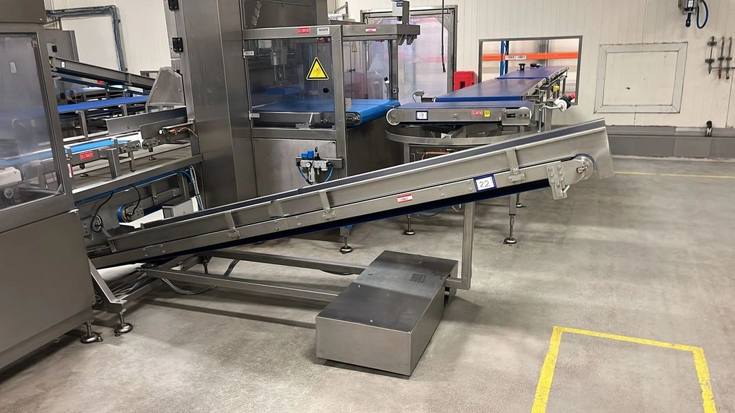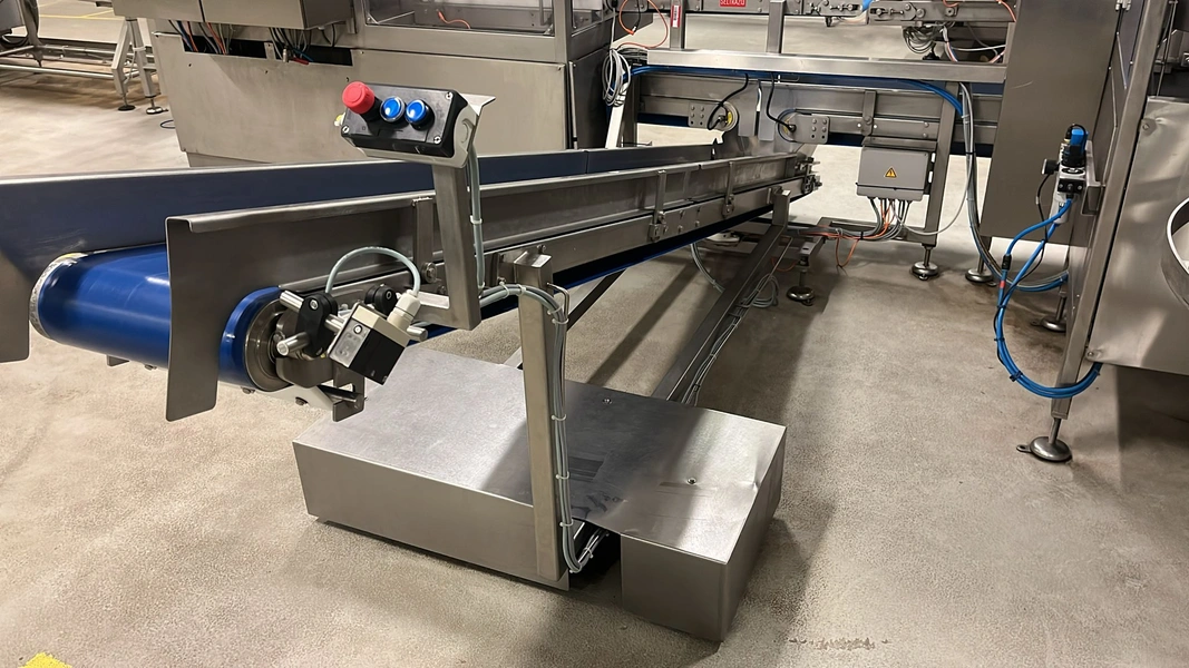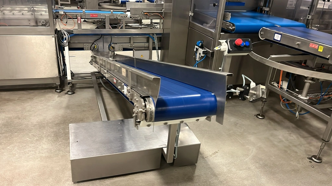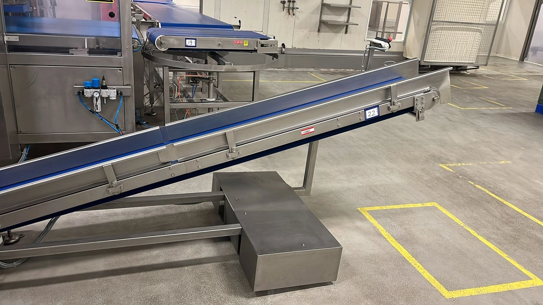Elevating belt, s/s frame, plastic belt, belt width: 300 mm, elevating height: 1100 mm, total dimensions: 3600 mm x 1100 mm x 1330 mm.