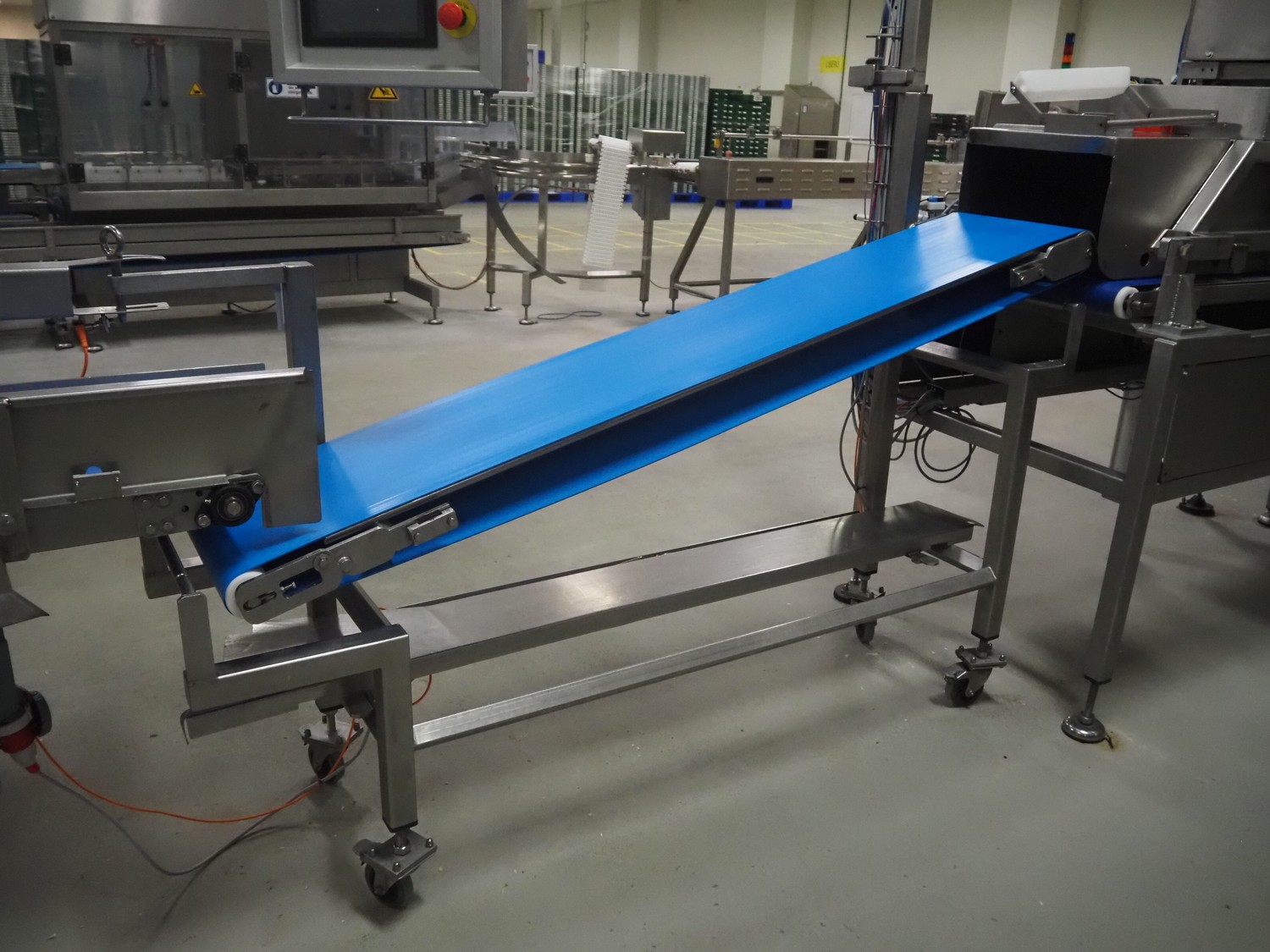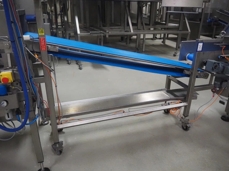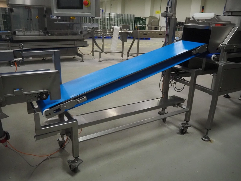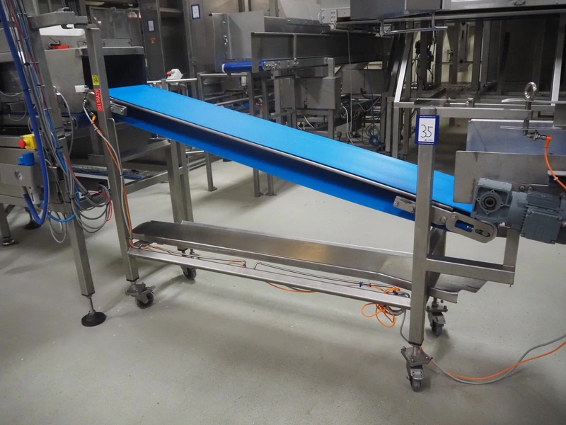 Mobile elevating belt, s/s frame, plastic belt, belt width: 380 mm, elevating height: 1170 mm, total dimensions: 2000 mm x 500 mm x 1520 mm.