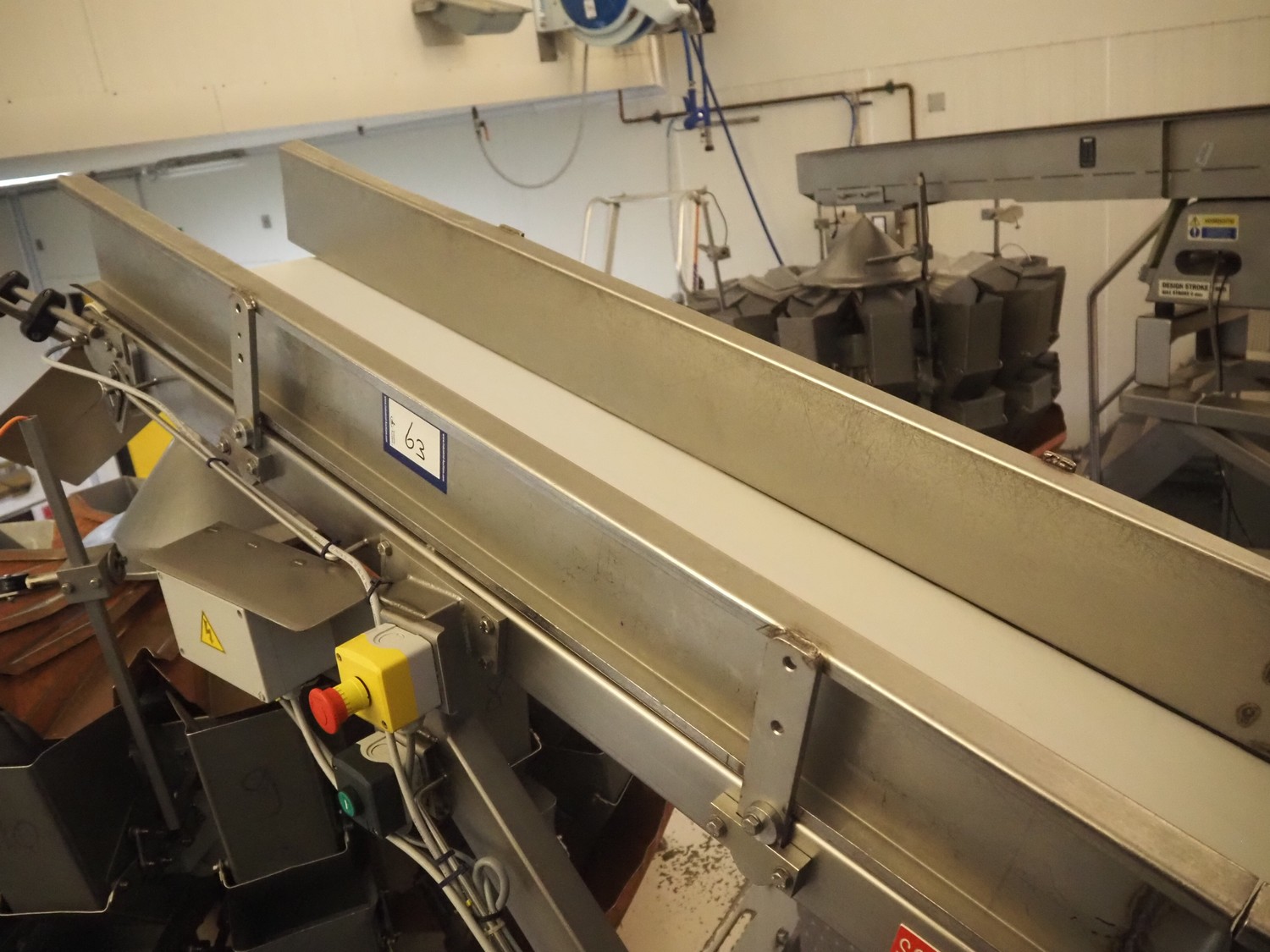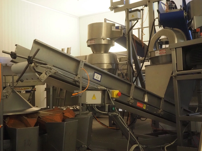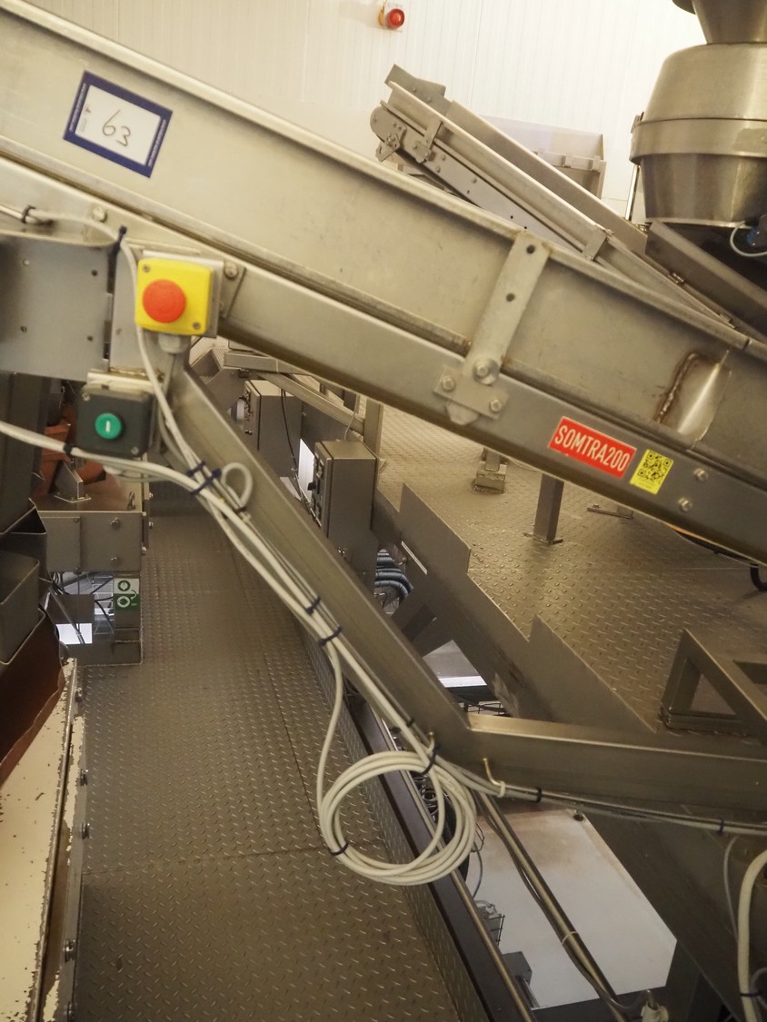 Elevating belt, s/s frame, plastic belt, belt width: 320 mm, clearance bunker: 600 mm x 470 mm, elevating height: 800 mm, total dimensions: 2500 mm x 600 mm x 1180 mm.
