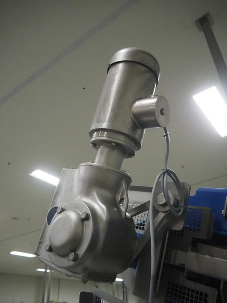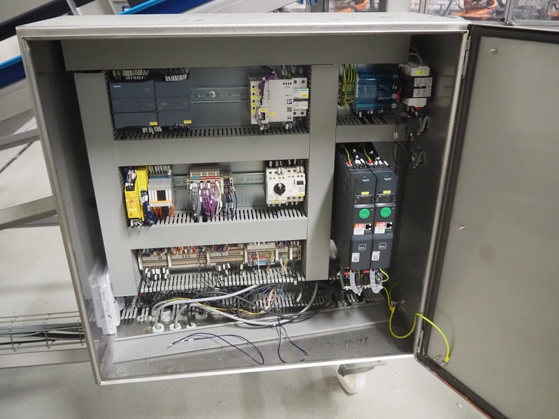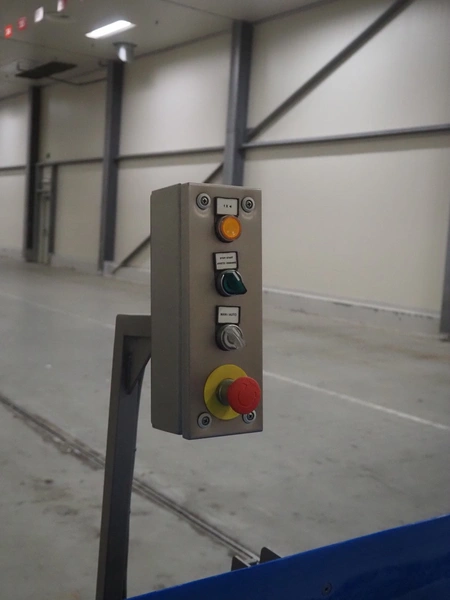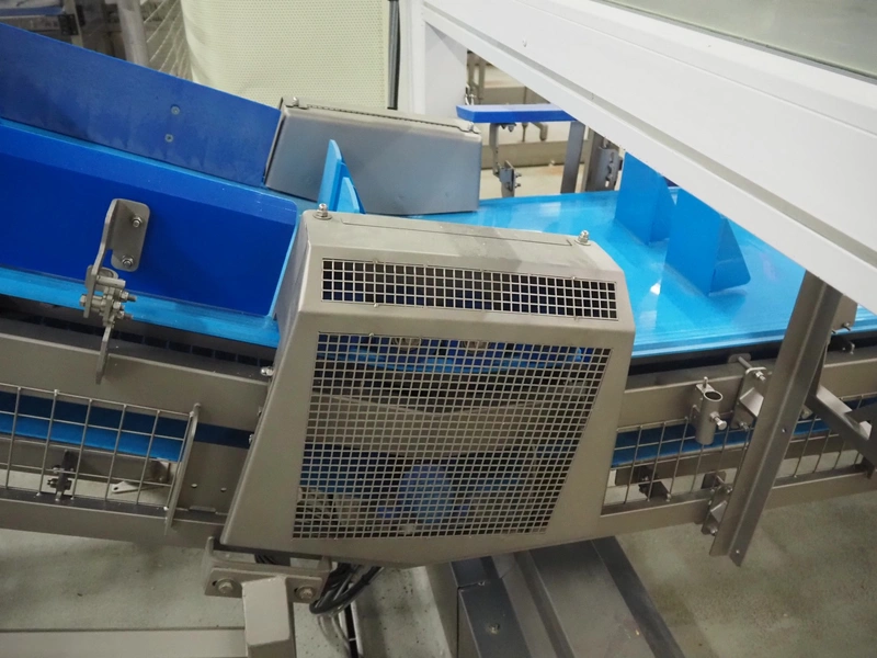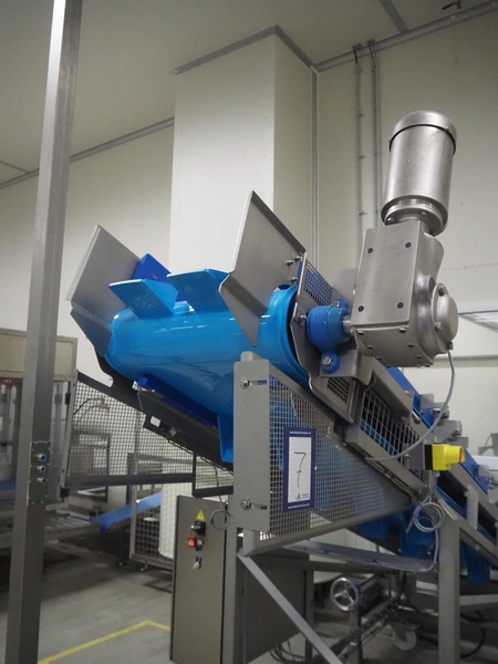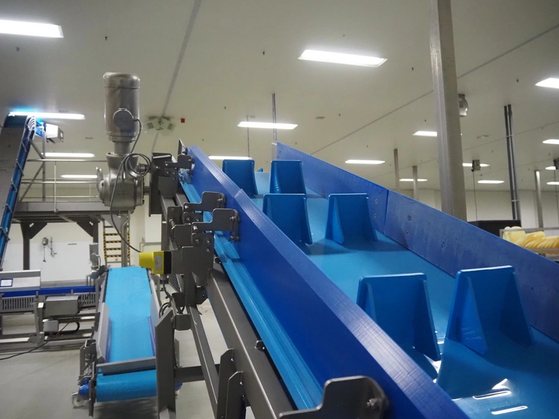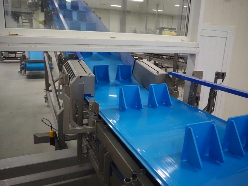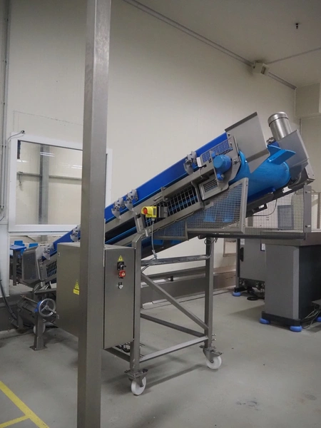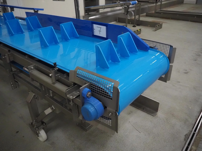 Stumaco mobile elevating belt, type: 20 209 02, year of construction: 2021, plastic belt with dividers, belt width: 680 mm, dividers height: 150 mm, distance between dividers: 550 mm, elevating height: 1950 mm, total dimensions: 7400 mm x 1350 mm x 2430 mm.