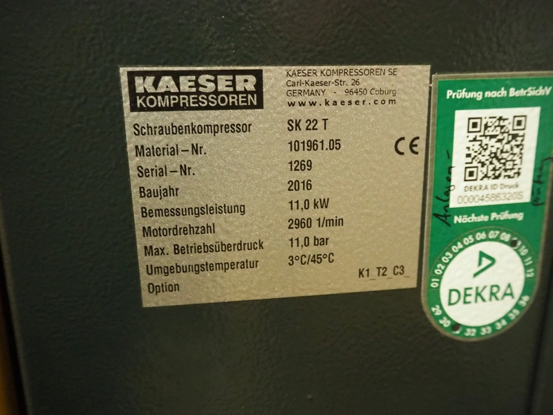 Kaeser Kompressoren SE air screw compressor, model: SK 22 T, serial number: 1269, year of construction: 2016, 400 V, 3 Ph, 50 Hz, dimensions: 1200 mm x 750 mm x 1280 mm.