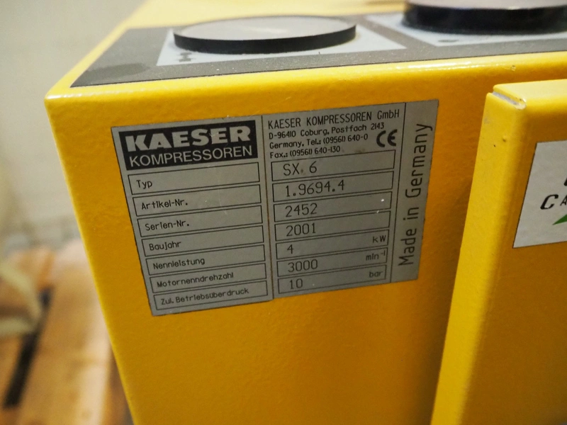 Kaeser Kompressoren GmbH air screw compressor, type: SX 6, serial number: 2452, year of construction: 2001, 4 kW, dimensions: 600 mm x 570 mm x 660 mm.