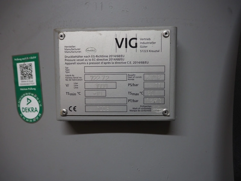 VIG steel pressure vessel, fabrication number: 72272, year of construction: 2016, volume: 1000 litres, dimensions: ø 800 mm x 2450 mm.