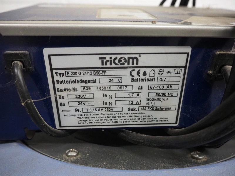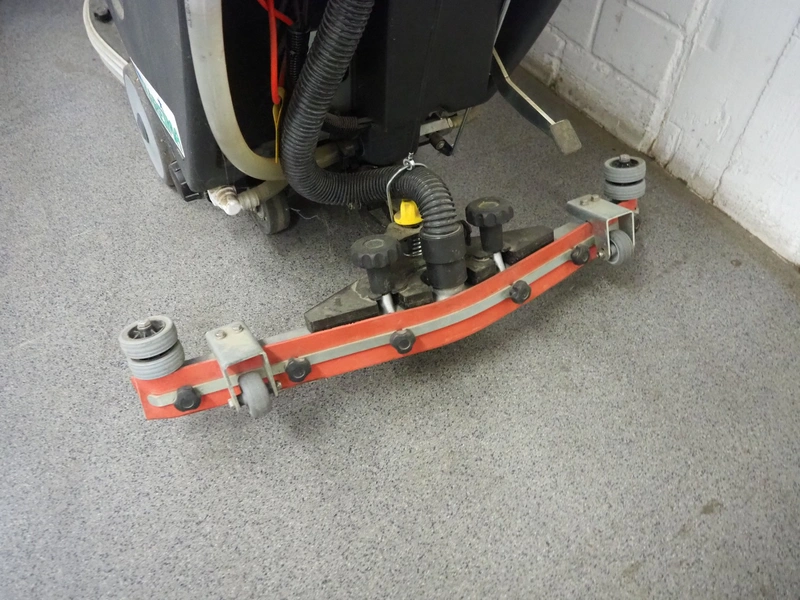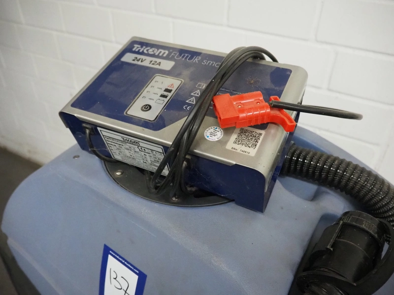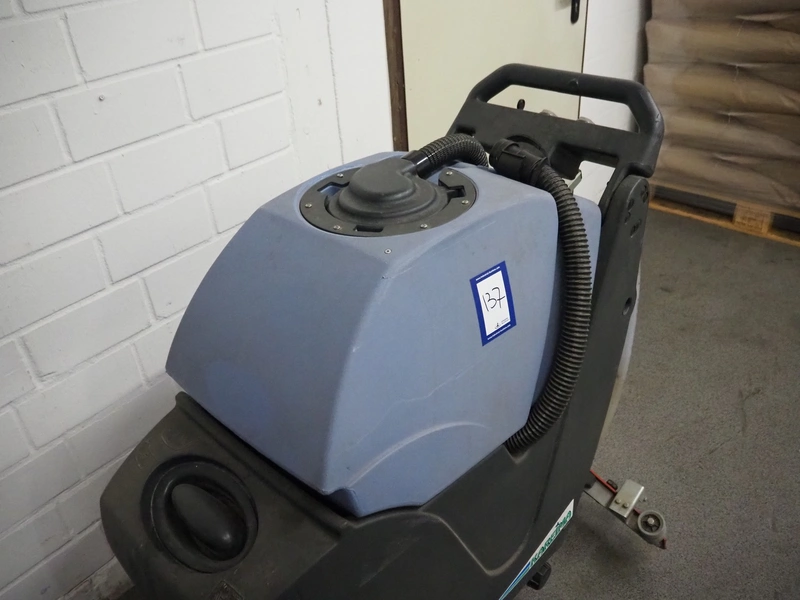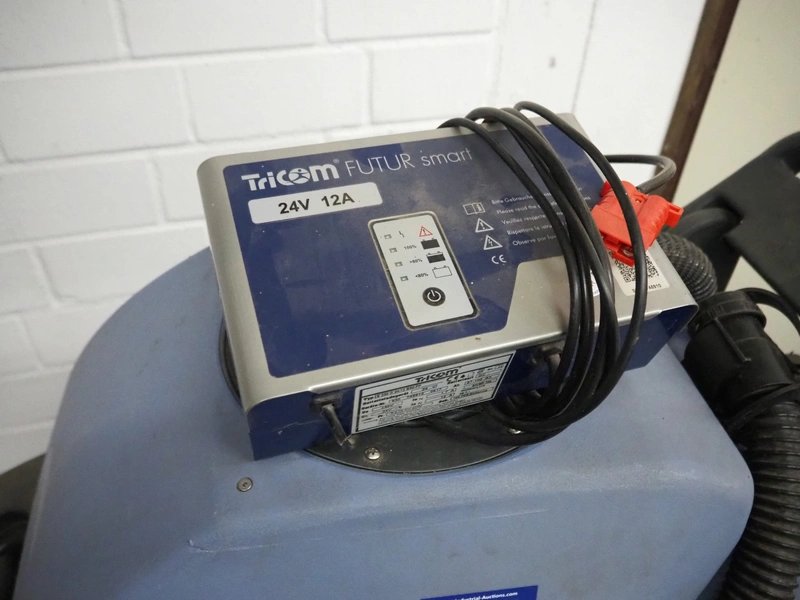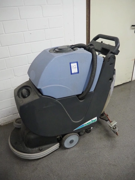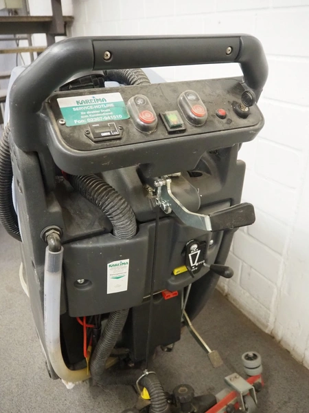 Kareima floor scrubbing machine, dimensions: 1200 mm x 600 mm x 1100 mm. Including battery charger, dimensions: 250 mm x 160 mm x 90 mm.