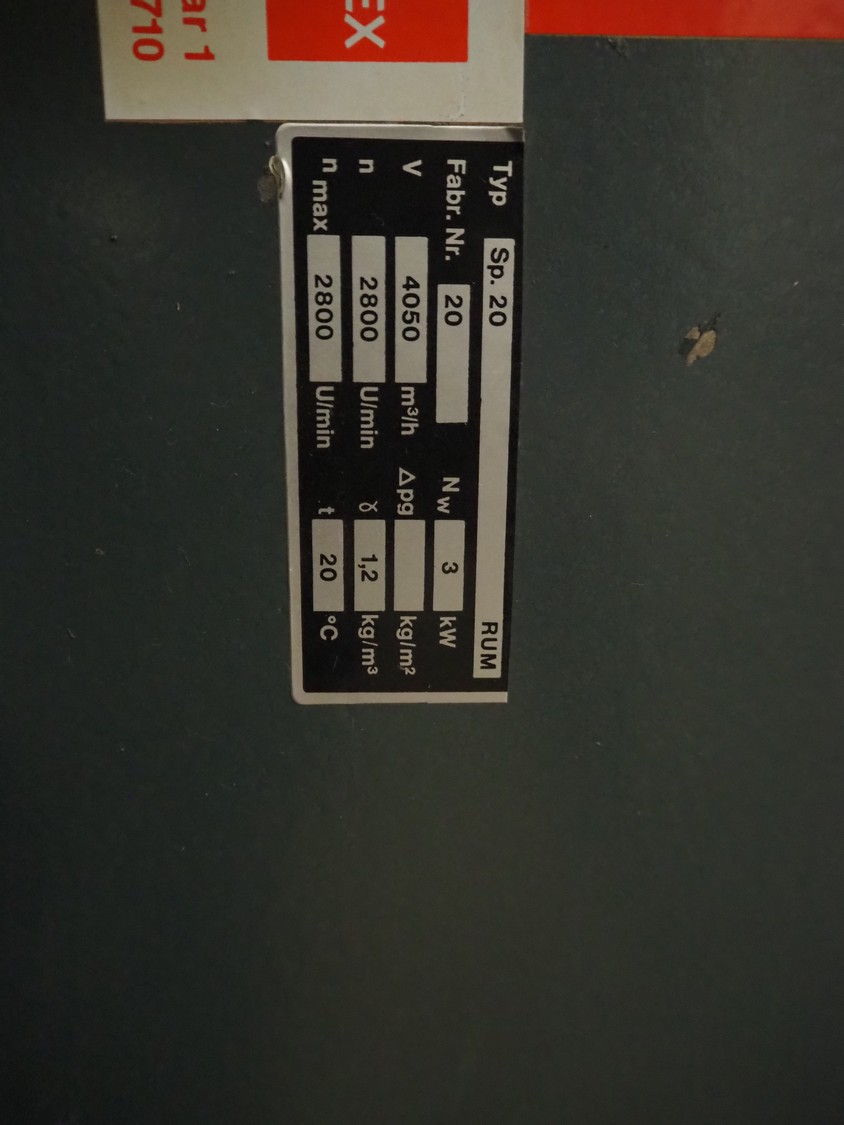 Spänex blower, type: Sp. 20, fabrication number: 20, 4050 m³/h, dimensions: 650 mm x 650 mm x 800 mm.