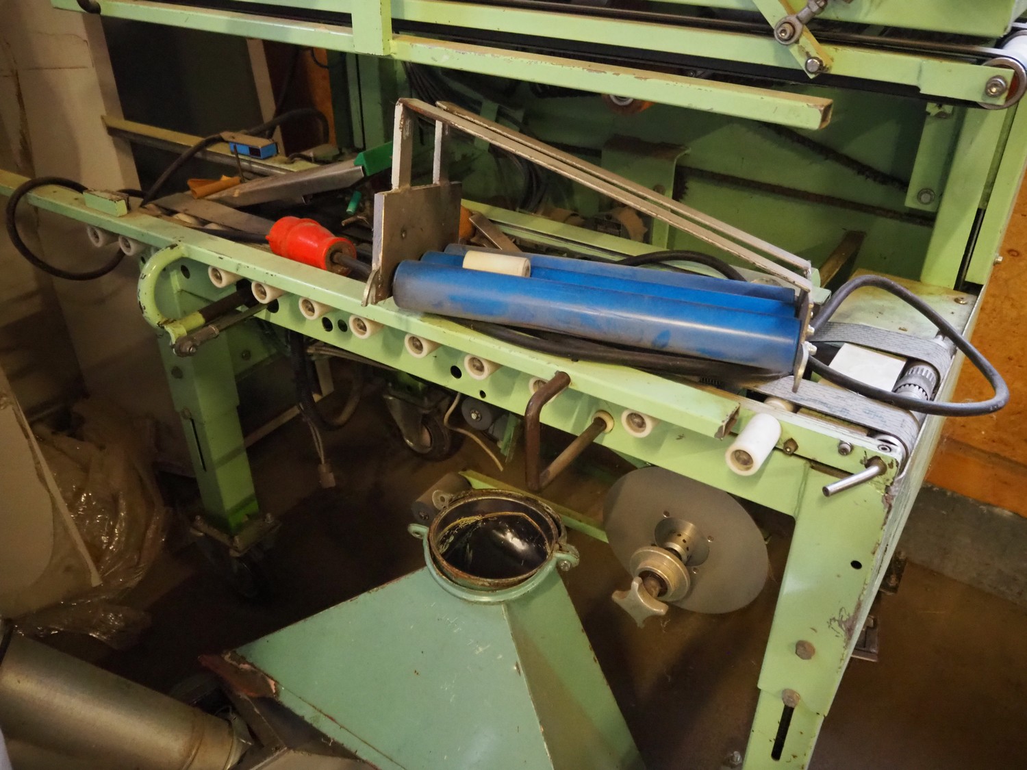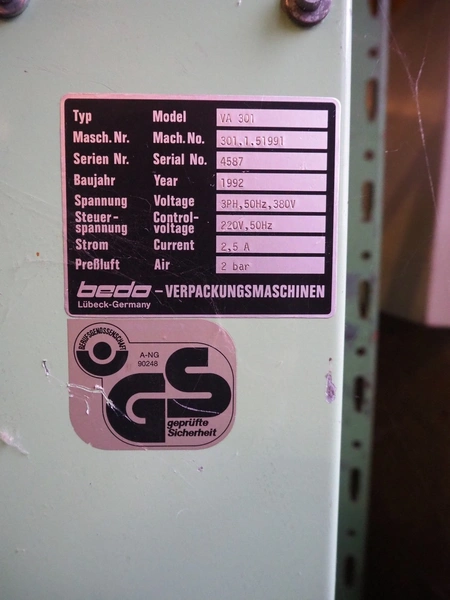 Bedo-Verpackungsmachinen box closing machine for parts, model: VA 301, serial number: 4587, year of construction: 1992, 380 V, 3 Ph, 50 Hz, 2.2 A, adjustable clearance, dimensions: 1550 mm x 800 mm x 1800 mm. Incomplete.